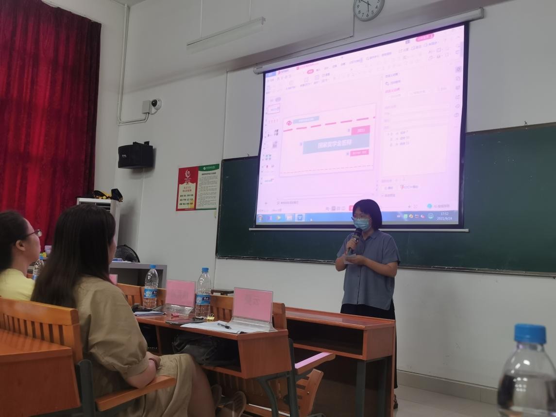 为了促进我校学风建设,进一步落实国家奖学金政策,本着公平、公正、公开、择优、透明的原则,发挥资助育人的功能和效力,激励广大学生发奋学习、全面发展、立志成才。2021年9月24日下午,北海艺术设计学院2021-2022年度国家奖学金答辩会在功德楼110教室成功举行。本次答辩会由学工处处长班媚主持,由设计艺术学院院长李林平、动画与传媒学院院长庞定坤、人文教育学院院长熊秀峰、美术学院副院长龚为、公共基础教学部主任杨莹、创新创业学院院长云曼、建筑与环境艺术学院第二党总支副书记岳莹及服装党支部书记曾麟、建筑与环境艺术学院学工办主任曲玥担任评委。34名由二级学院推选的国家奖学金候选人参加了此次答辩会。