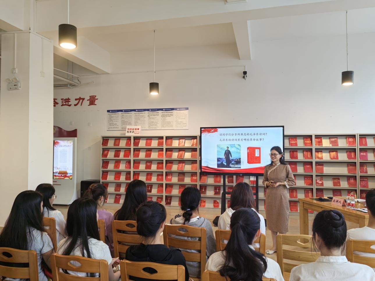 11月7日下午5:00,刘贻敏老师在图书馆三楼“红色阅读角” 举办红色知识专题讲座,本期讲座的主题是红色记忆 历史丰碑——毛泽东诗词里的党史。我校舞蹈学院积极分子到场聆听讲座并参与互动,氛围良好,同学们纷纷表示受益匪浅。(张家梅摄)
