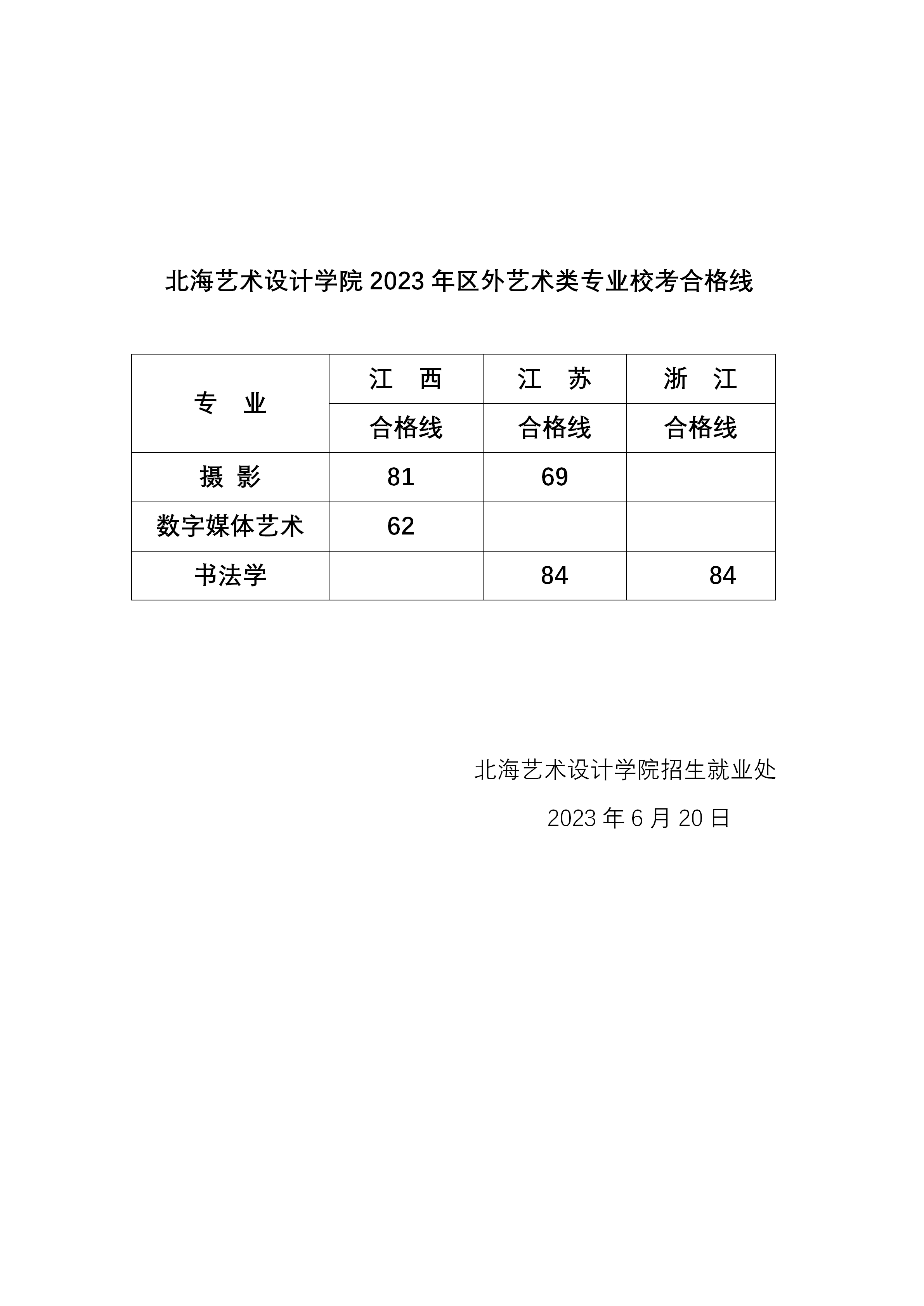 北海艺术设计学院2023年区外艺术类专业校考合格线