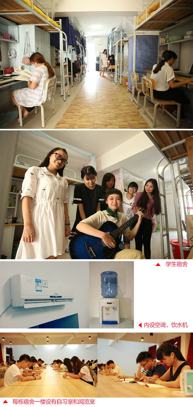 住宿条件:学生公寓楼按相关标准建造,南北通透,实现住宿功能区分,通讯、网络入户,配用组合式家具及智能化用电管理等;宿舍区每层还设有的洗浴、洗衣等公共服务设施,每间宿舍都安装空调;配有饮水机;上床下桌;衣柜;独立卫生间和洗漱间;为学生提供24小时热水供应。每栋宿舍一楼还配有标准化自习室和阅览室,为学生提供良好的学习、生活氛围。所有学生宿舍(公寓)楼,实行专业化的管理与服务,实施标准化保洁、维护作业,实行“以人为本”的管理和服务;同时倡导学生民主参与、自律管理、自助服务,共同营造文明、整洁、安全、温馨的“学生之家”。