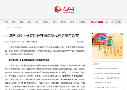 2021年12月28日,人民网以《北海艺术设计学院团委开展沉浸式党史学习教育》为题,关注报道了我校团委多维度营造党史学习教育浓厚氛围,带动广大青年深入感受红色力量,组织开展沉浸式党史学习教育。