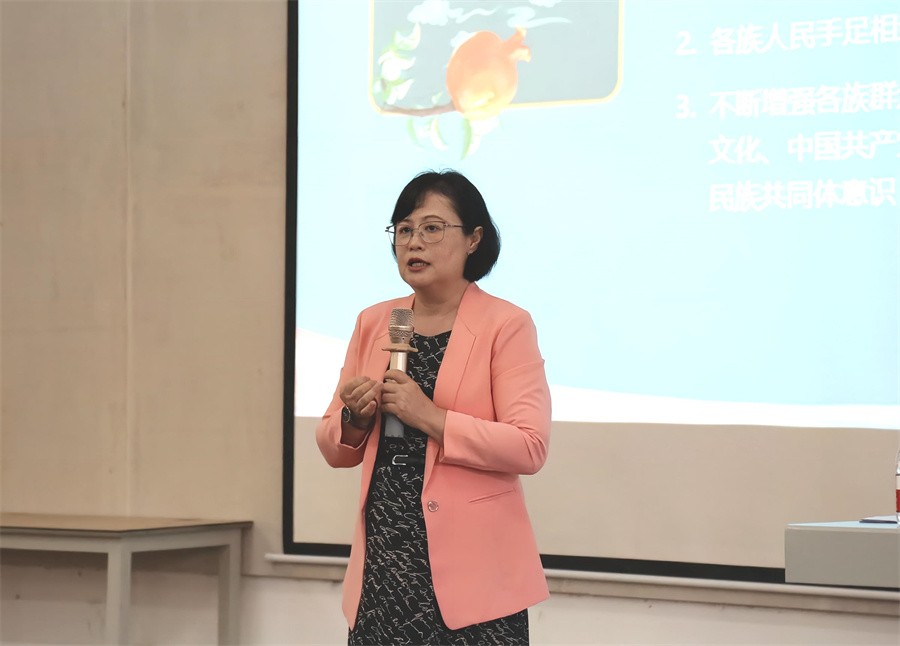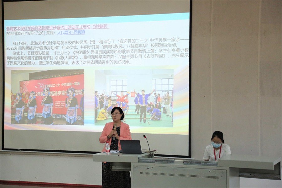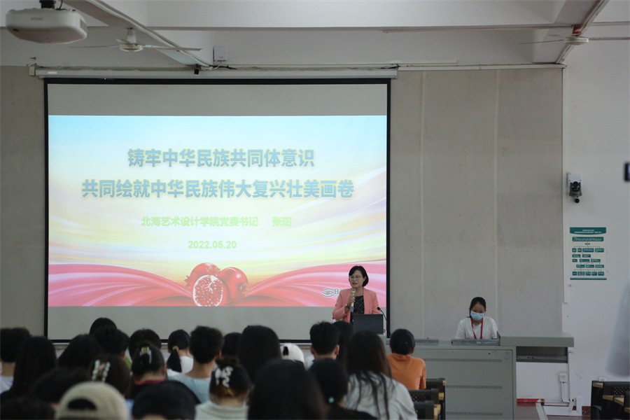 张阳以“北海艺术设计学院民族团结进步宣传月活动”启动仪式视频为切入点,从“团结之源”“变化之巨”“长远之治”三个方面,深入浅出地解读了铸牢中华民族共同体意识,带领学生回顾中华各民族共同奋斗史,通过一系列生动案例、详实数据阐述新时代我国民族团结进步事业的长足发展,指出民族团结的历史必然性、现实针对性、极端重要性,引导学生不断推动“五个认同”“三个离不开”“六个相互”在心中扎根发芽,进一步深化民族团结认识,树立铸牢中华民族共同体理念,抓好民族团结生命线。张阳指出,青年学子担负着民族复兴的重任,是国家未来的主力军,各民族团结进步、共同繁荣发展是中华民族的生命所在、力量所在、希望所在,各族人民团结一心,携手奋进才能共创中华民族的美好未来。她殷切希望青年学子在青春赛道上奋发有为,肩负民族担当,同心协力加强民族团结,共同绘就中华民族伟大复兴的壮美画卷。