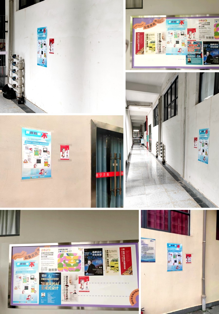 各教学楼层张贴“反邪教警示教育进校园”海报与宣传资料