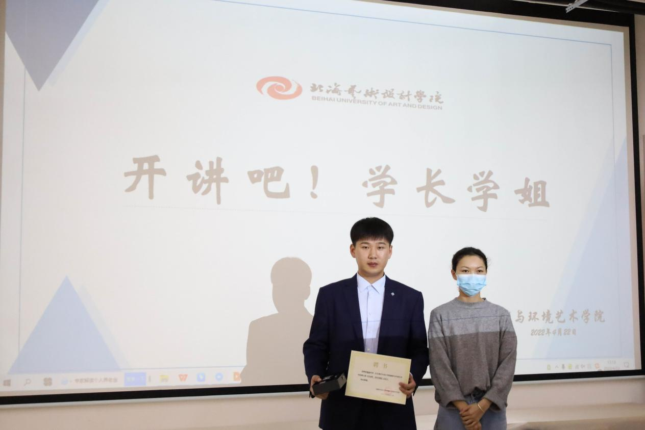 将分享共鸣,实力共达,经验共勉。4月22日下午4点建筑与环境艺术学院第五期《开讲吧!学长学姐》主题分享会于公德楼207顺利开展。活动邀请到我院19级优秀学生李嘉皓主讲。北海艺术设计学院校团委组织部部长陈文斌,建筑与环境艺术学院分团委书记雷勇、指导老师朱红瑞出席活动。