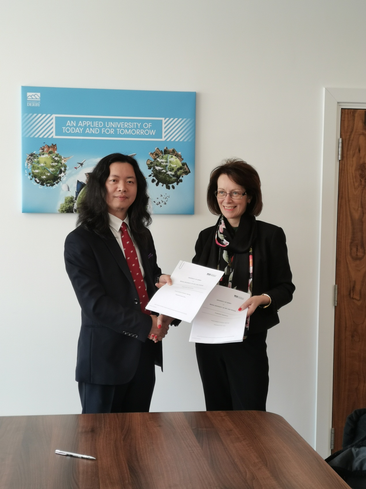 (我校执行董事郑超与英国德比大学常务副校长Dr.Judith签约)