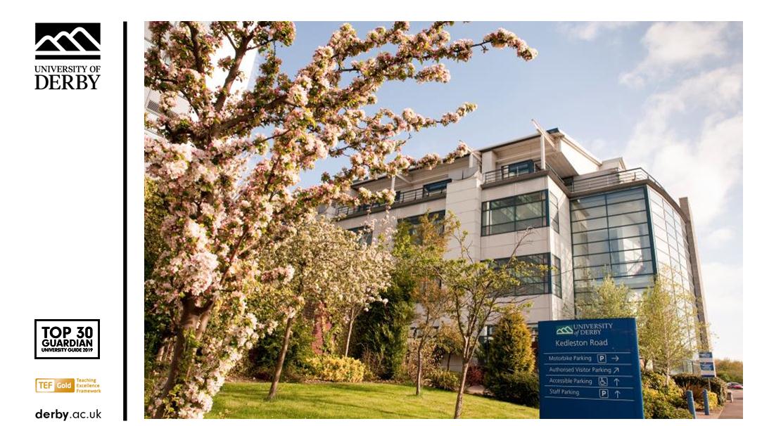 德比大学位于风景优美的英格兰中部德比郡,距离伦敦和曼彻斯特只有大概1个半小时的火车车程。德比大学拥有德比,切斯特菲尔德,以及巴克斯顿三个校区,有一万九千名在校学生,包括来自40多个国家的留学生,颁授100多个学士、硕士和博士学位。