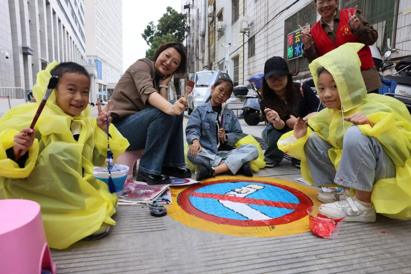 在医院喷泉旁、发热门诊前、内科楼后方,一系列富有深意的井盖图案呈现眼前,如“禁止吸烟、远离毒品、文明诚信、关爱母婴”等。大家手持画笔,挥洒色彩,将医院公共道路上原本单调的井盖转变为充满艺术气息的画作。