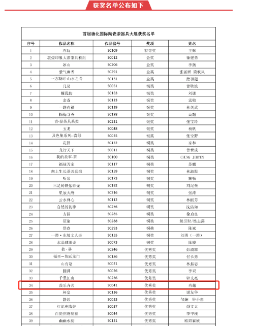 近日,第三届德化“中国白”中国传统陶瓷艺术双年展、首届德化国际陶瓷茶器具大展颁奖典礼及开幕式顺利落幕。开幕式上公布了第三届德化“中国白”中国传统陶瓷艺术双年展、首届德化国际陶瓷茶器具大展获奖名单。我校学生肖越的设计作品《鼓乐齐茗》喜获优秀奖。