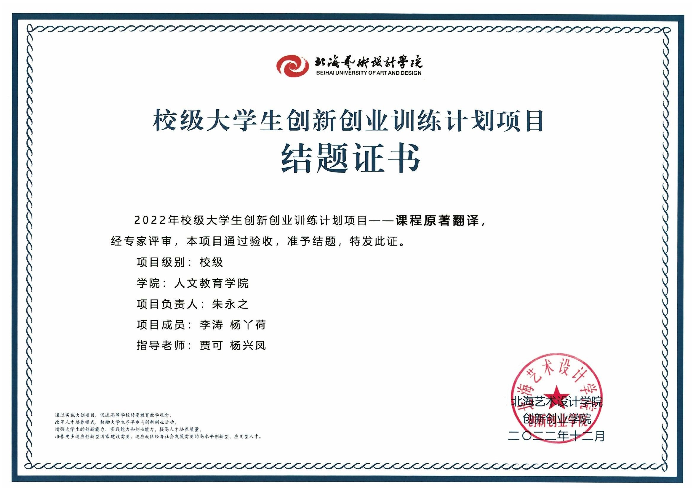 2022年校级大创项目结题证书