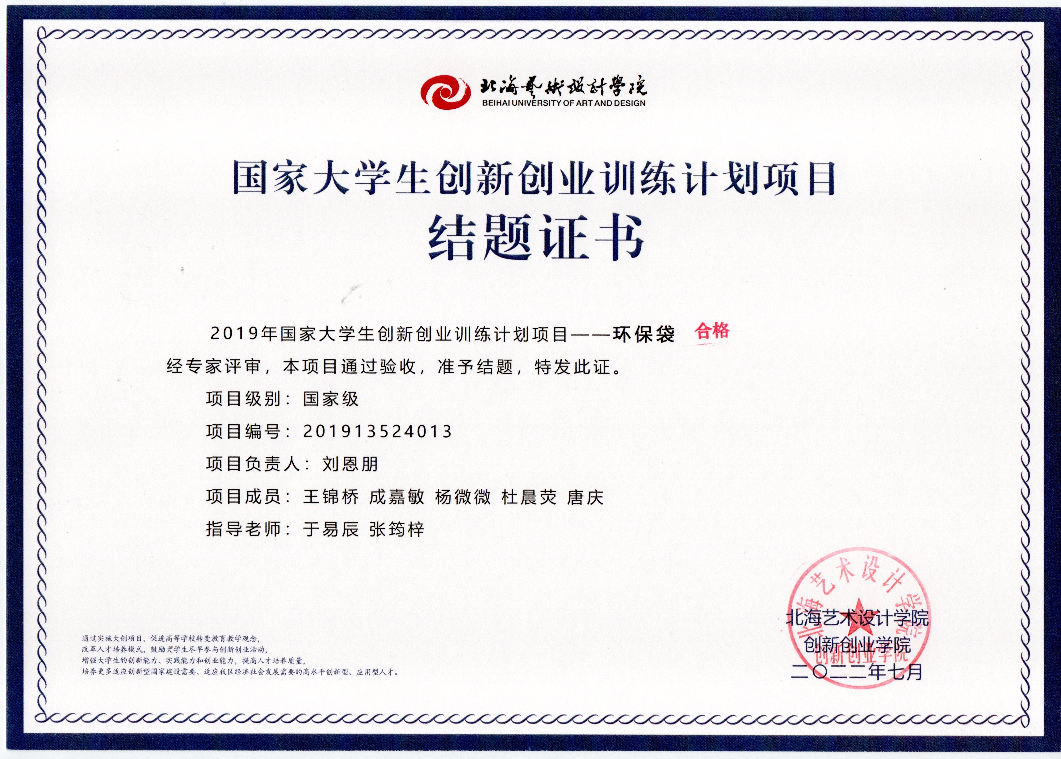 2022年大创项目结题证书(2019立项)