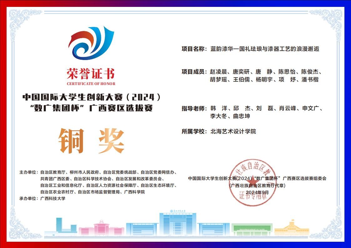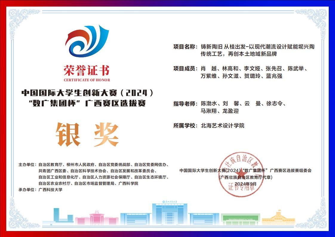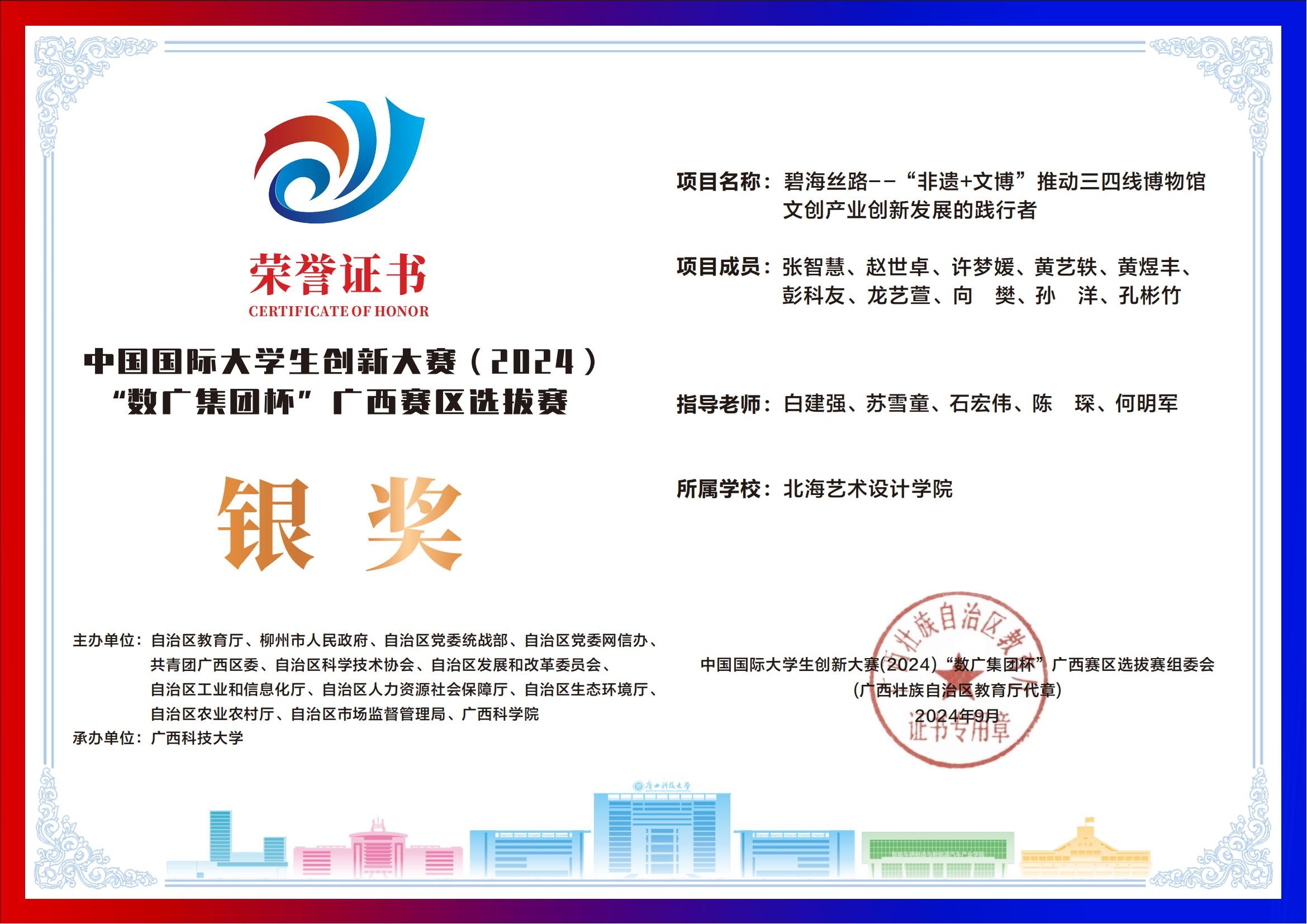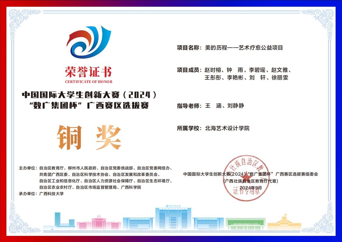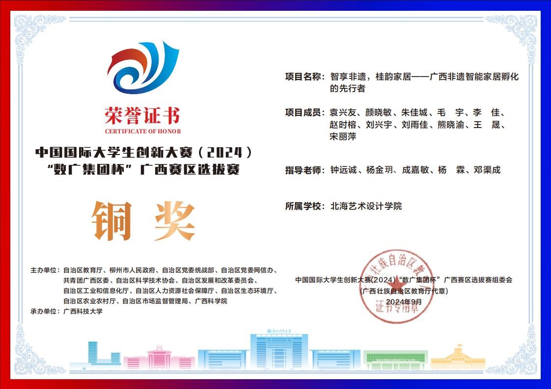 北海艺术设计学院中国国际大学生创新大赛(2024)“数广集团杯”广西赛区获奖证书