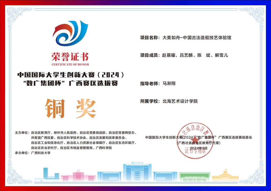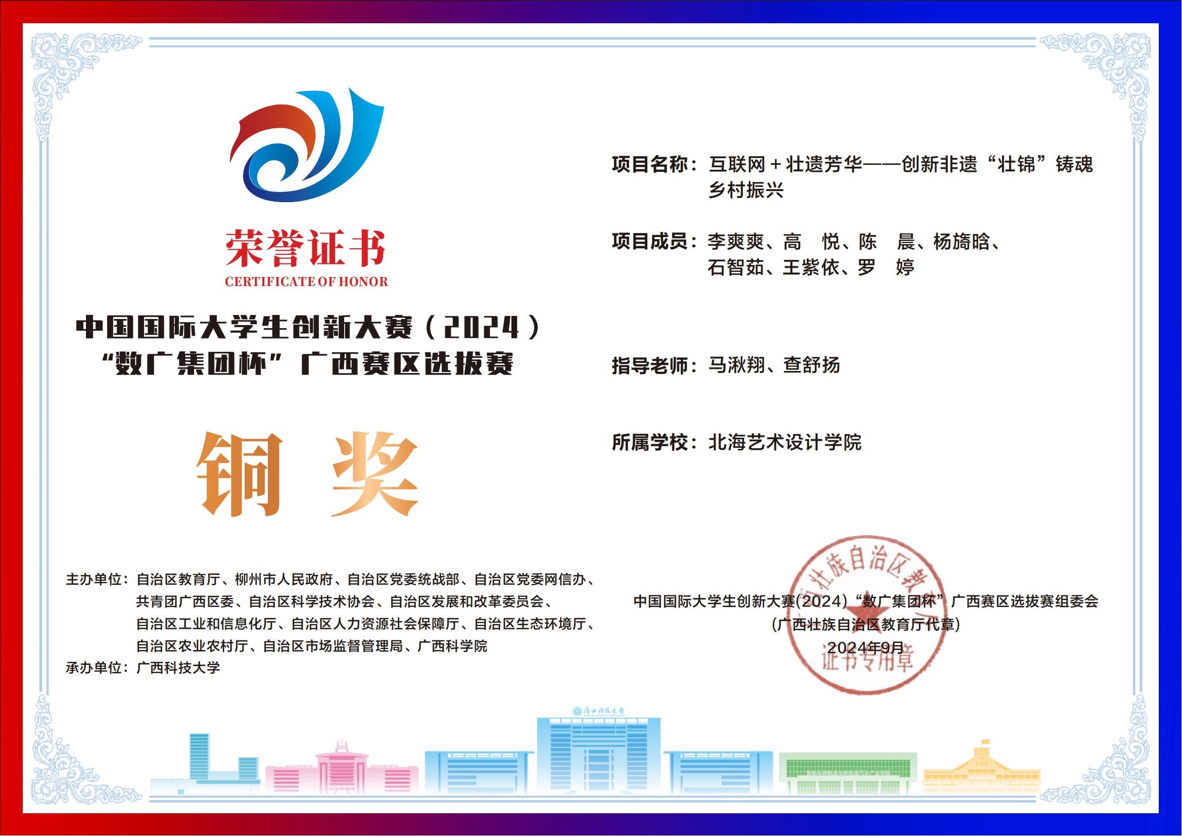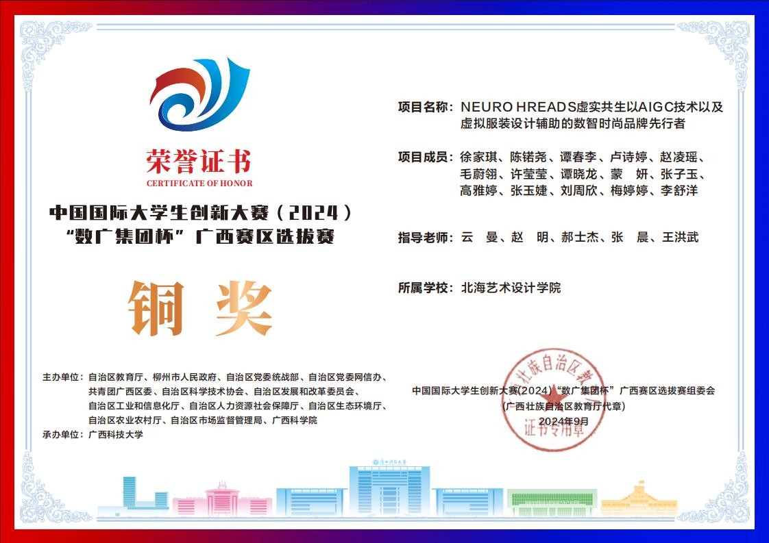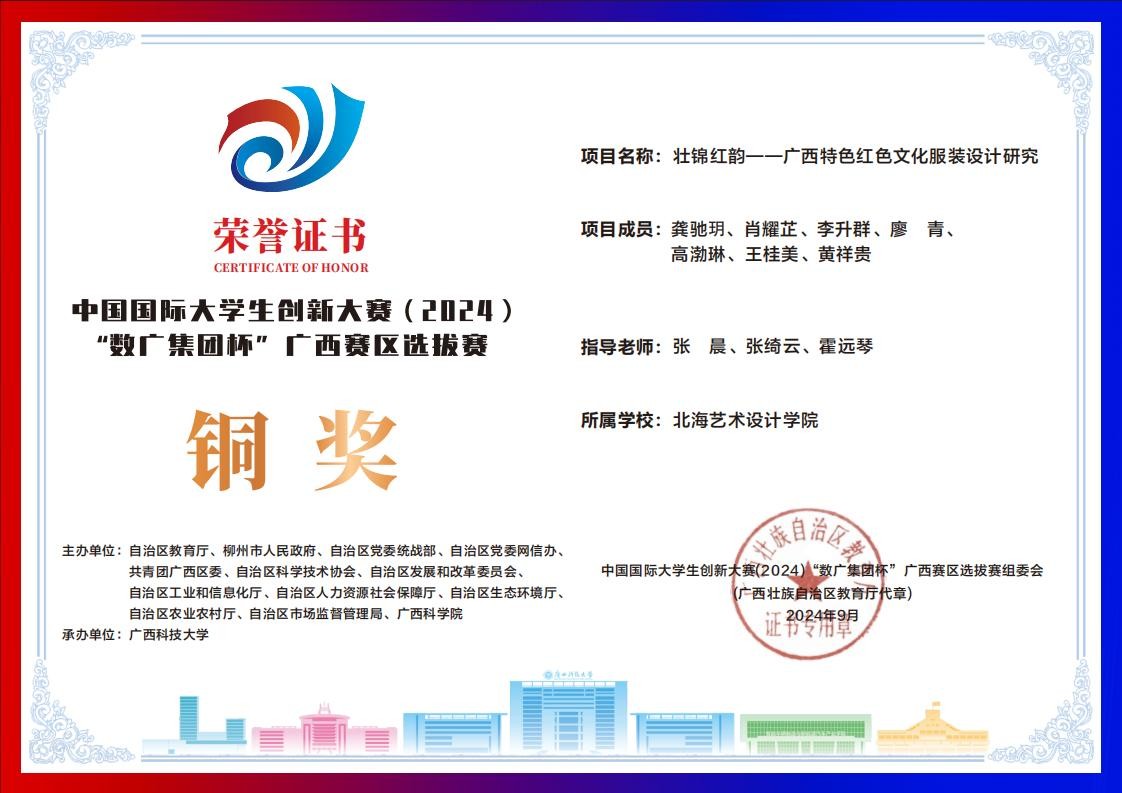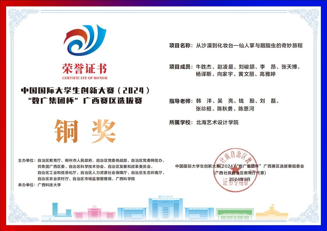 北海艺术设计学院中国国际大学生创新大赛(2024)“数广集团杯”广西赛区获奖证书