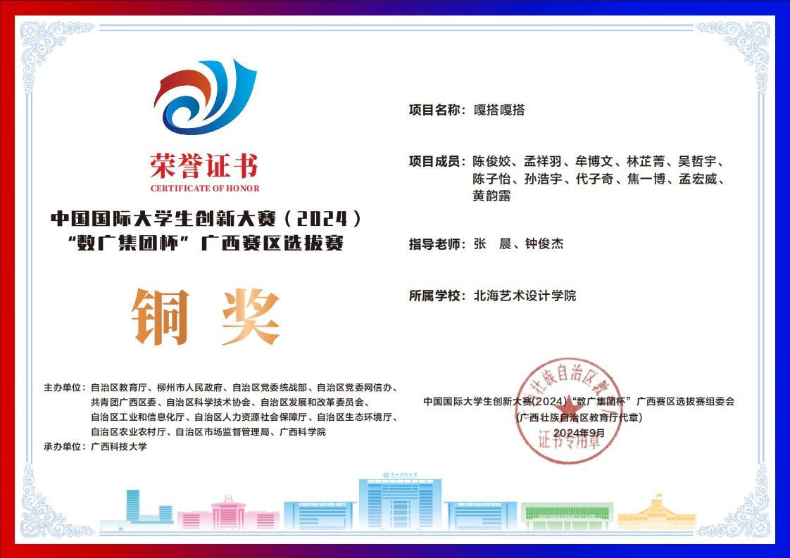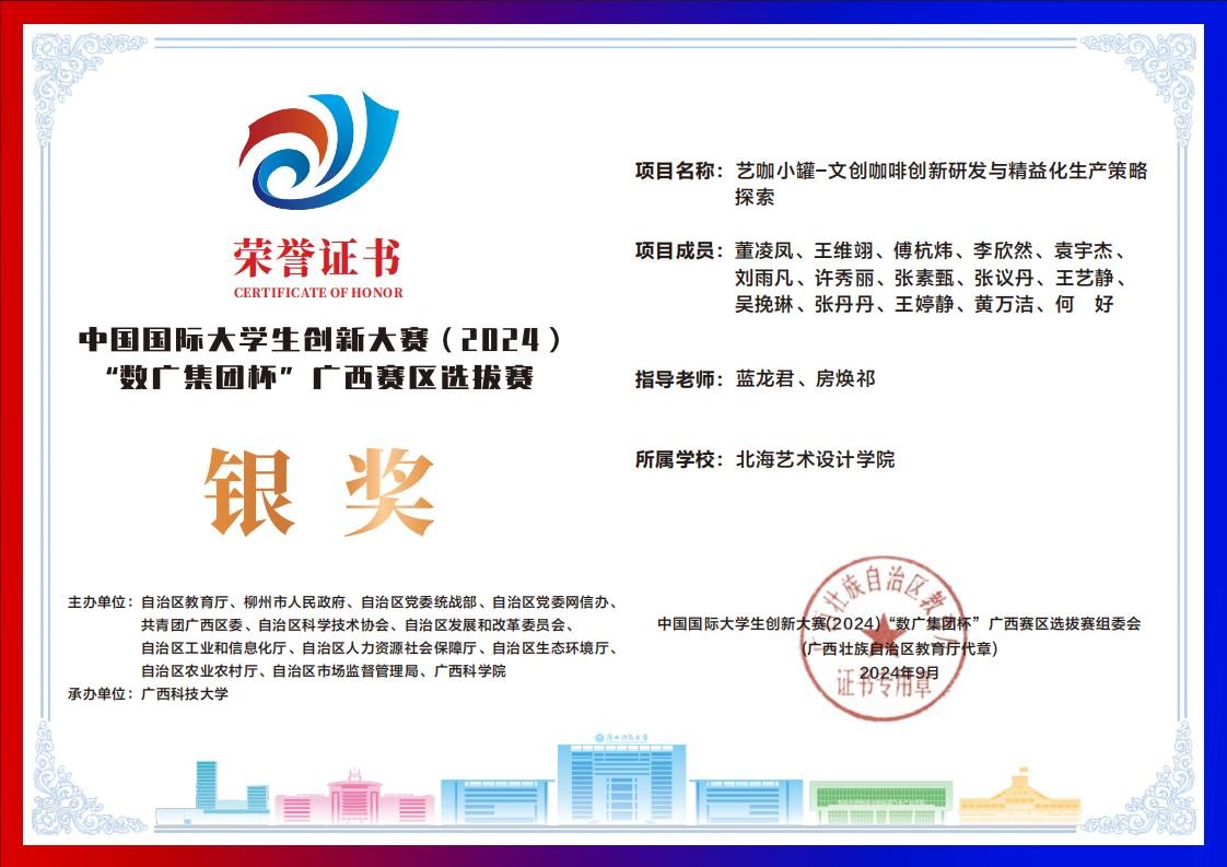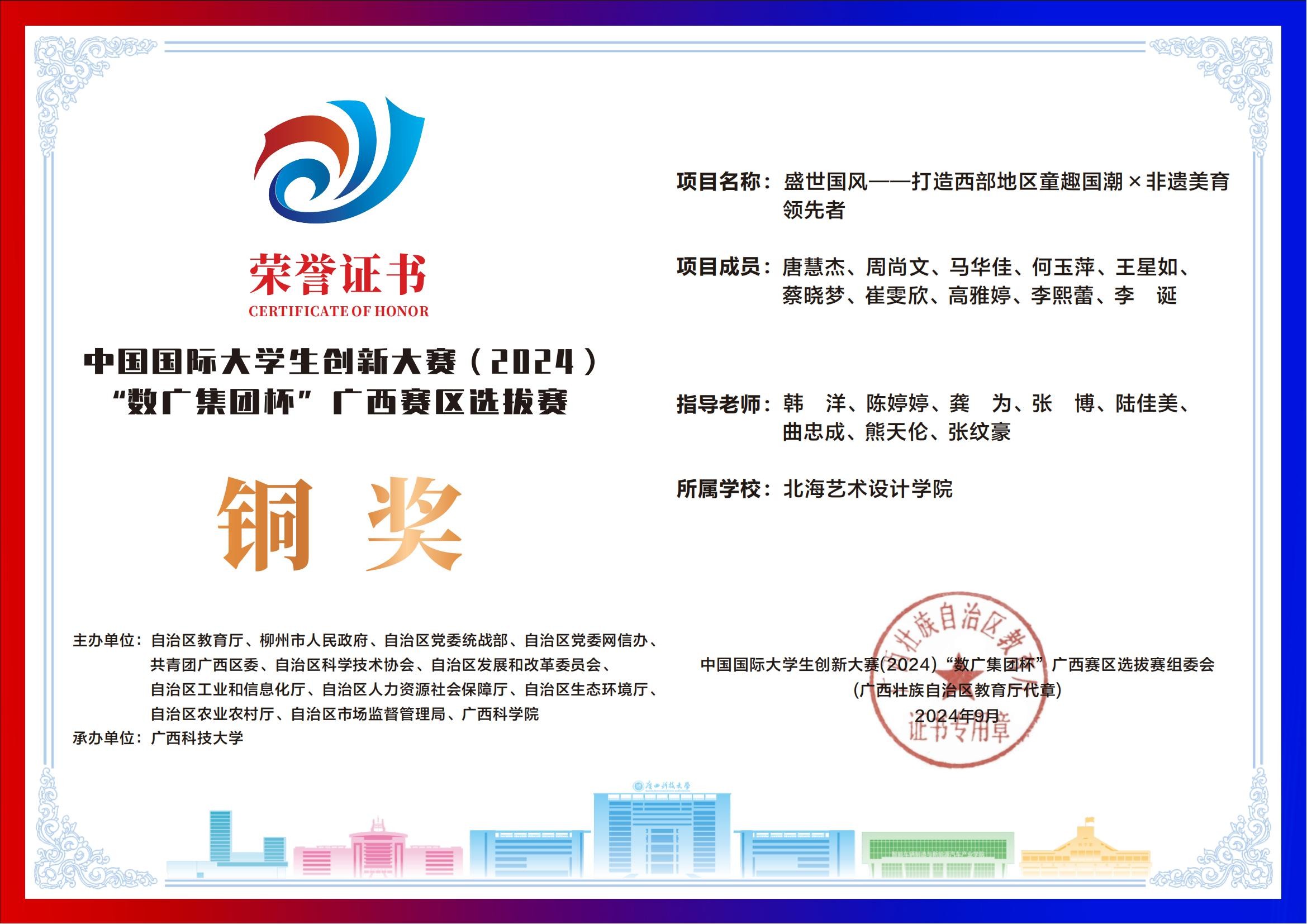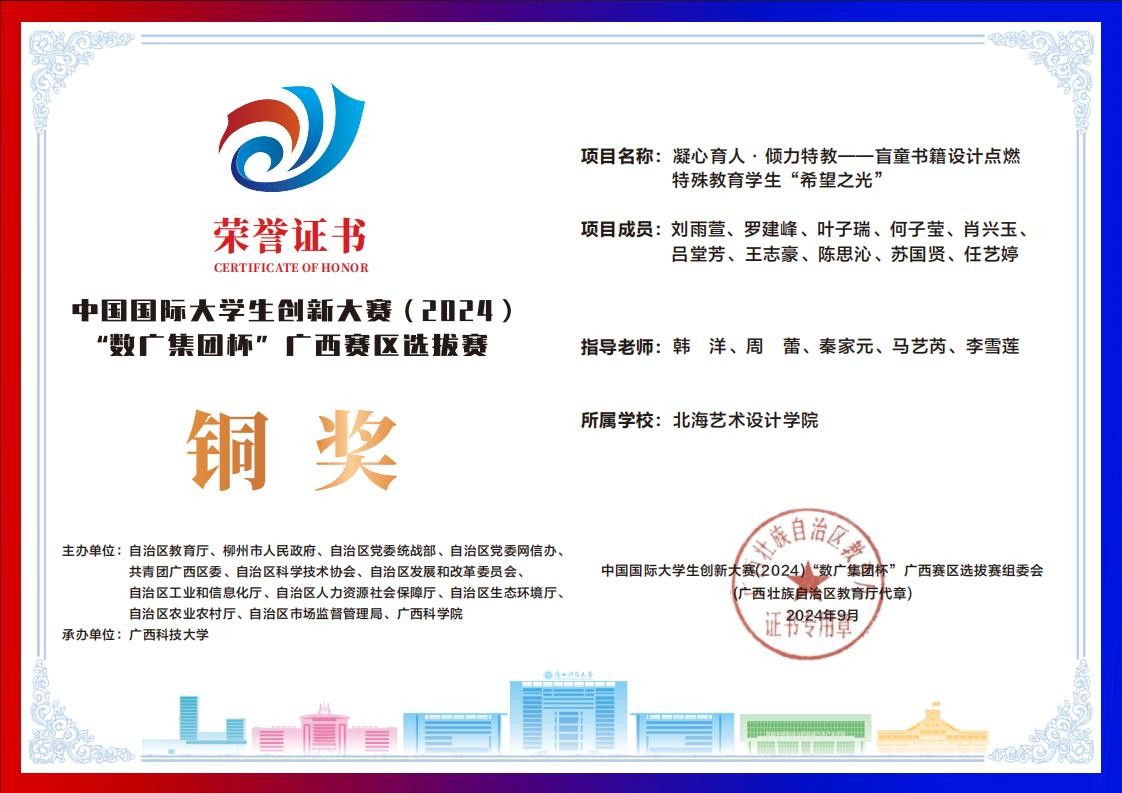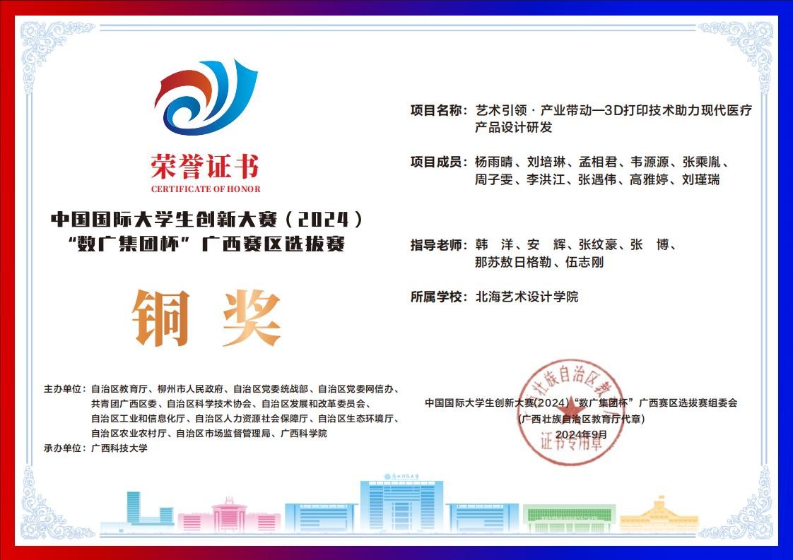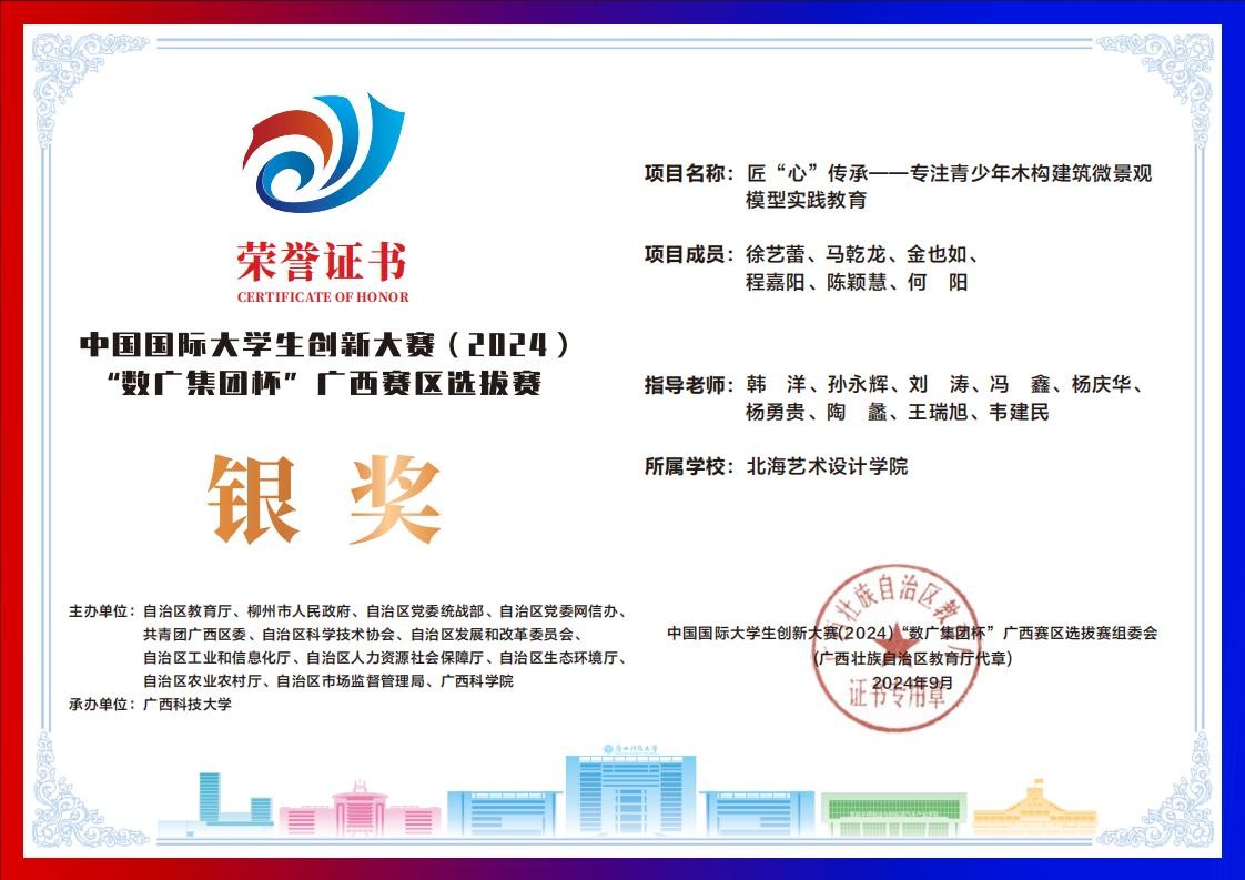 北海艺术设计学院中国国际大学生创新大赛(2024)“数广集团杯”广西赛区获奖证书