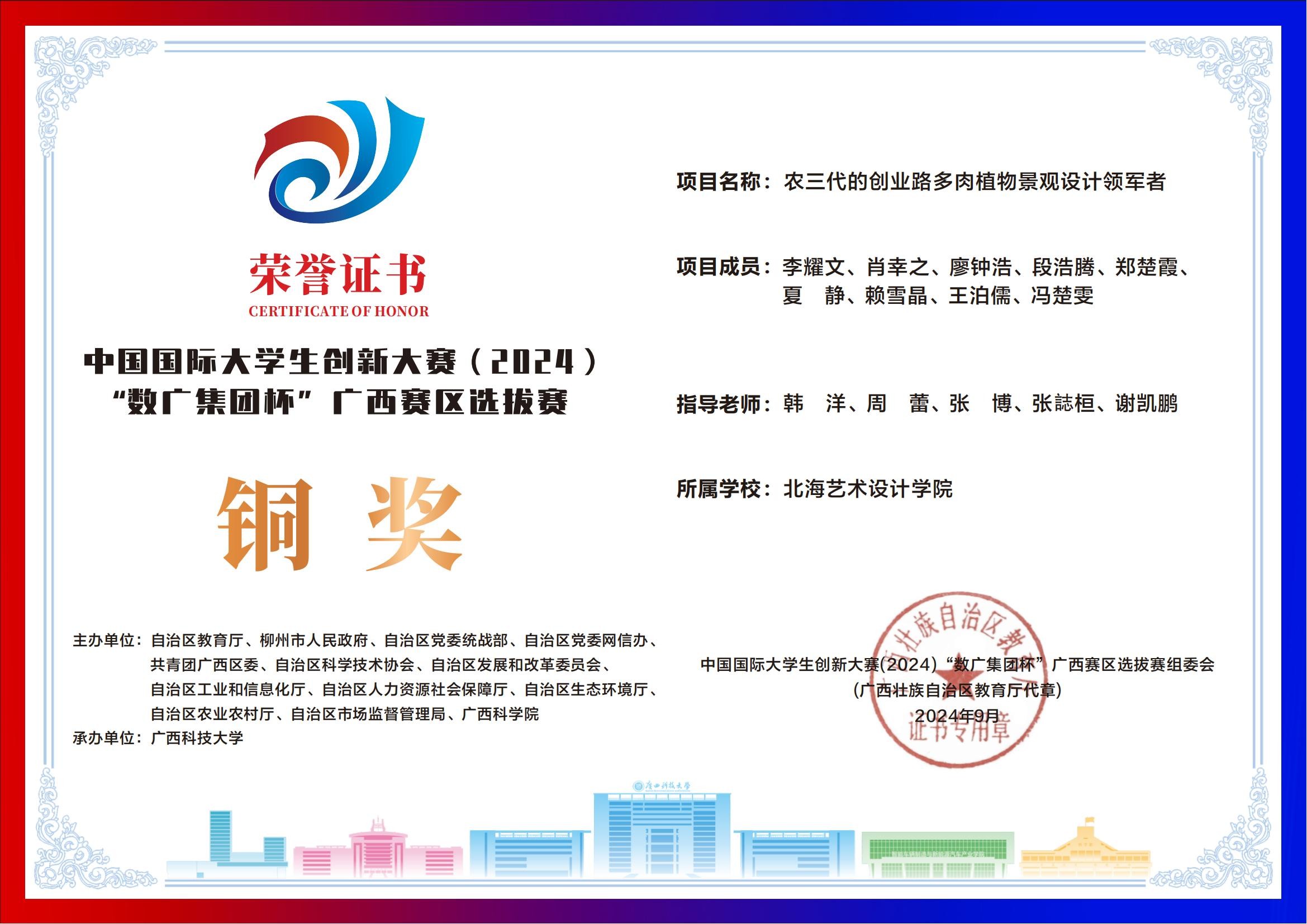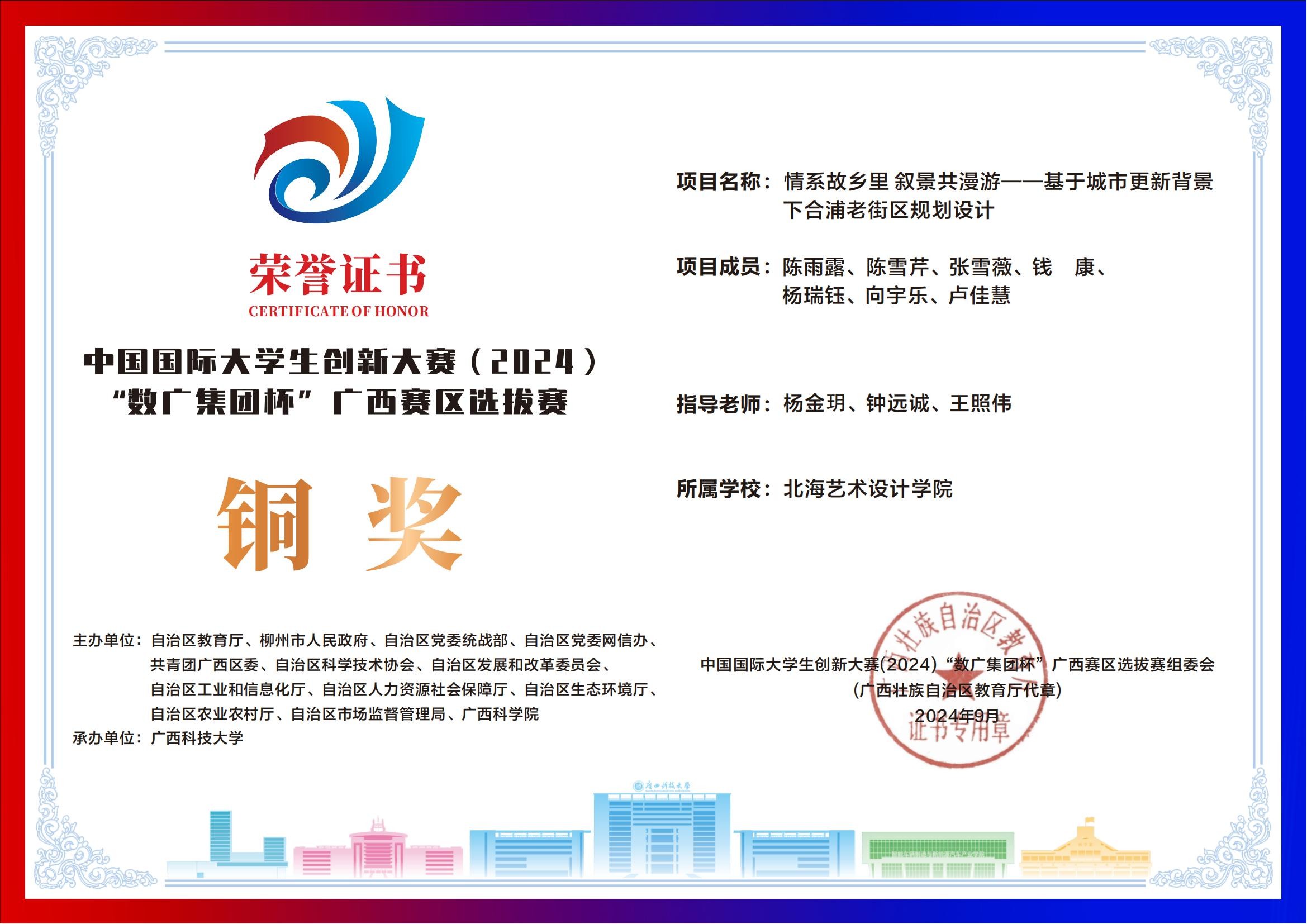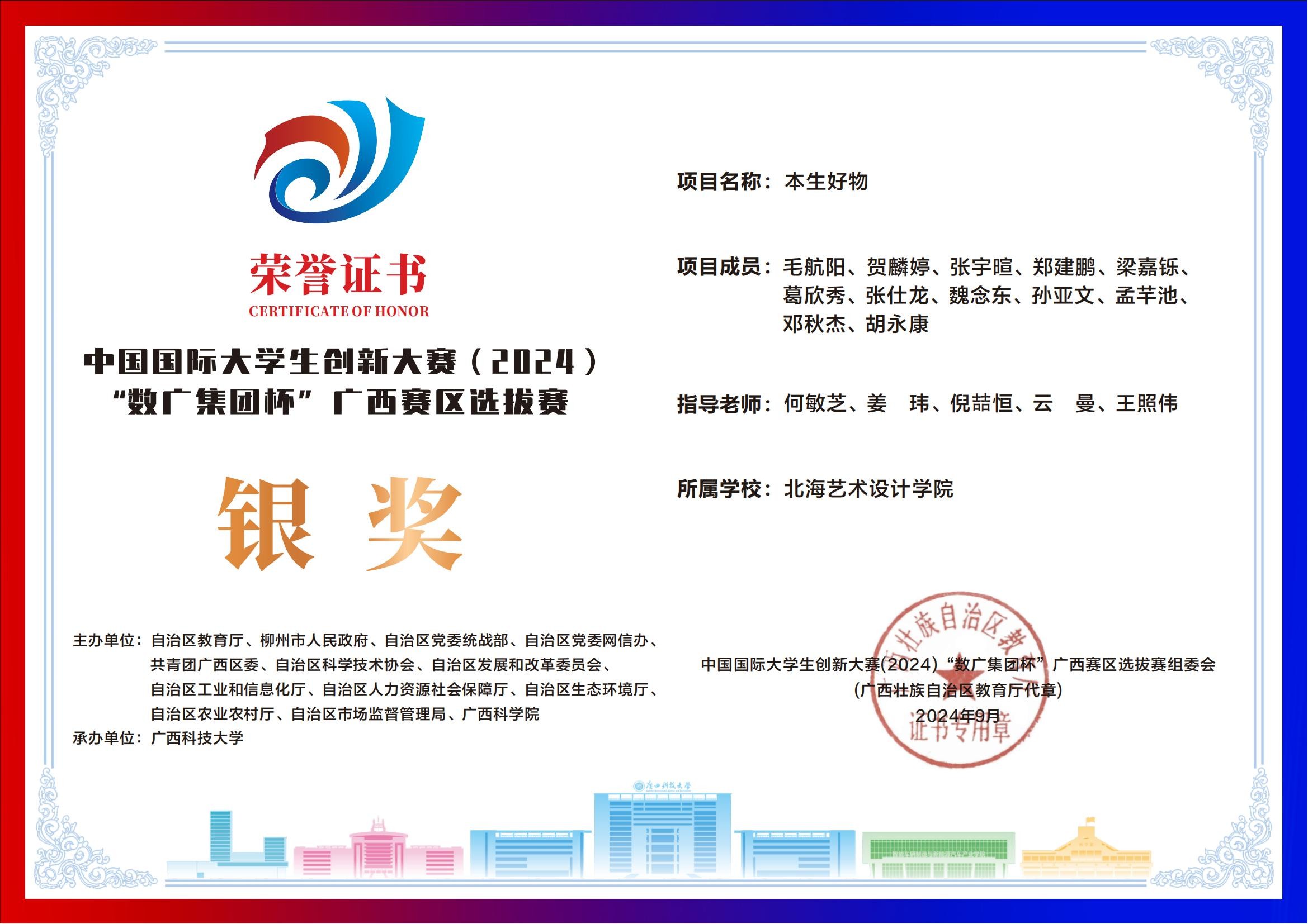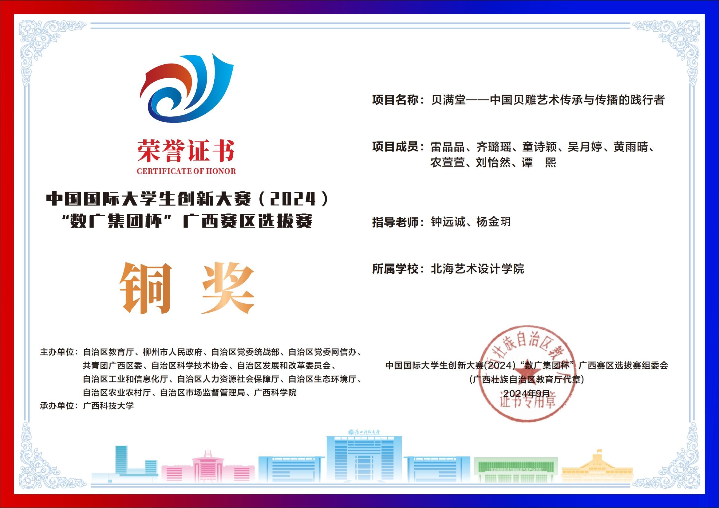 北海艺术设计学院中国国际大学生创新大赛(2024)“数广集团杯”广西赛区获奖证书