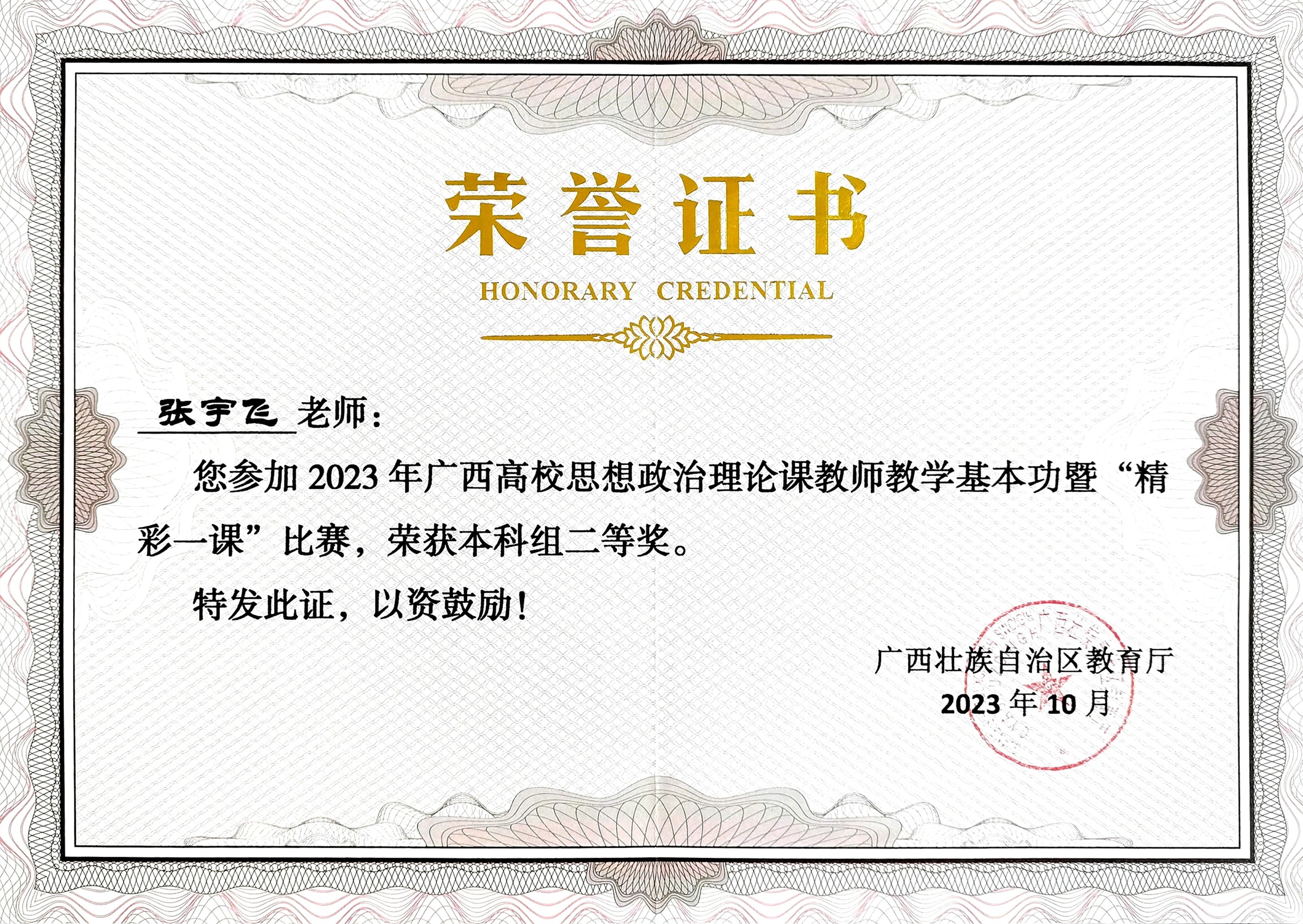喜报:我院教师张宇飞荣获2023年广西高校思想政治理论课教师教学基本功暨“精彩一课”比赛本科组二等奖