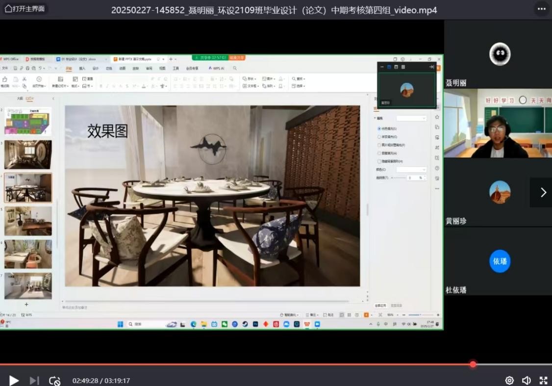 2025年2月24日至28日,建筑与环境艺术学院环境设计专业2025届本科毕业设计(论文)中期答辩工作圆满完成。此次中期答辩借助钉钉、腾讯会议等线上教学平台,完成2021级12个班级516名学生中期汇报及答辩工作。
