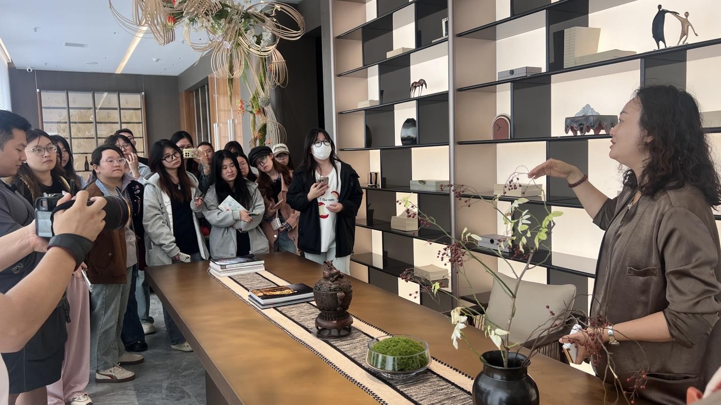 活动还邀请玛格・极品牌方经理专题分享品牌场景构建与发展规划。学生实地参观各大品牌展厅,触摸樱桃木、红橡木等材质纹理,观察榫卯金属装饰与弧形工艺细节,结合讲解理解材质工艺适配场景;同时通过测量空间布局、分析家具搭配与灯光设计,将“空间设计理论”转化为“实际呈现效果”,深化对材质、工艺、市场趋势的认知,强化理论实践结合能力。​