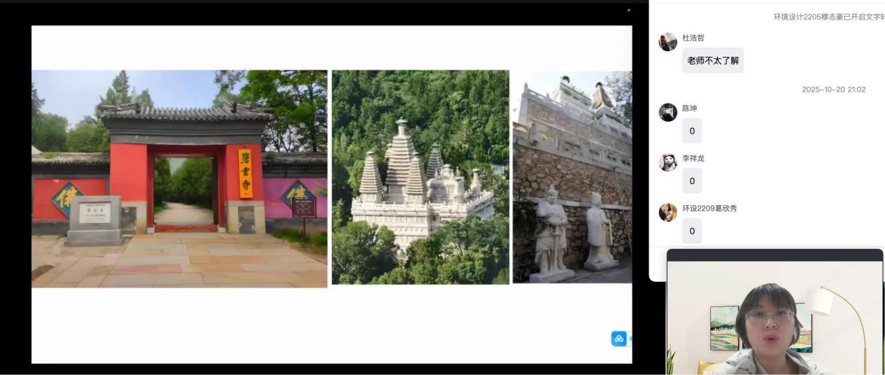 为避免实地考察陷入“只观其表、不解其理”的困境,王思涵老师在实践前开展90分钟“香山考察攻略”线上前置教学,为学生搭建系统的理论框架。课程以清代“三山五园”历史脉络为切入点,重点梳理静宜园“内垣、外垣、别垣”的环套式空间格局;结合具体案例深入解析——从勤政殿“面水依山”的传统风水布局,到致远斋汉白玉石桥的形制特征,再到碧云寺“危桥跨涧”所体现的宗教建筑群轴线组织逻辑,层层递进地帮助学生建立“历史沿革—空间结构—建筑特色”的三维认知,为后续实地调研做好充分理论铺垫。​