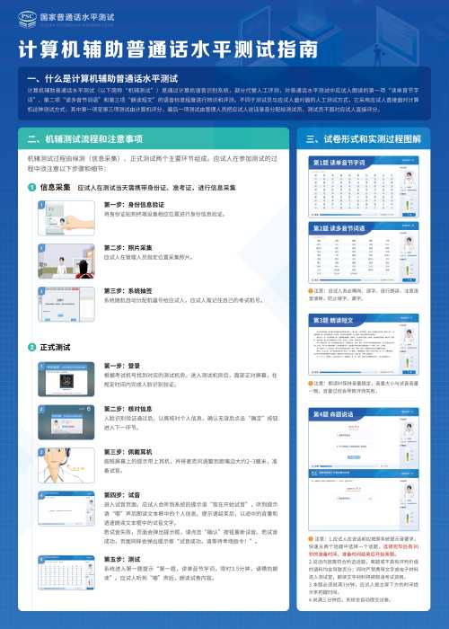 (二)考试流程。具体考试流程按照计算机辅助普通话水平测试指南(附件1)、普通话水平测试考试指南(附件2)执行。