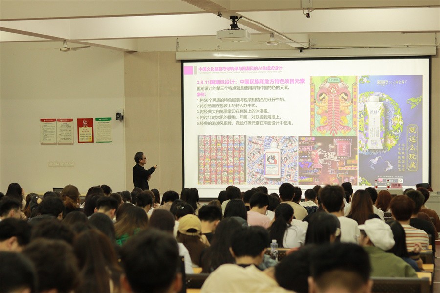 3月11日晚,于我校西校区伦理楼107,中国美术学院教授、博士生导师范凯熹为我校师生带来一场题为《中国文化基因符号转译与国潮风的AI生成式设计》的精彩讲座,讲座由设计艺术学院副院长白建强主持。