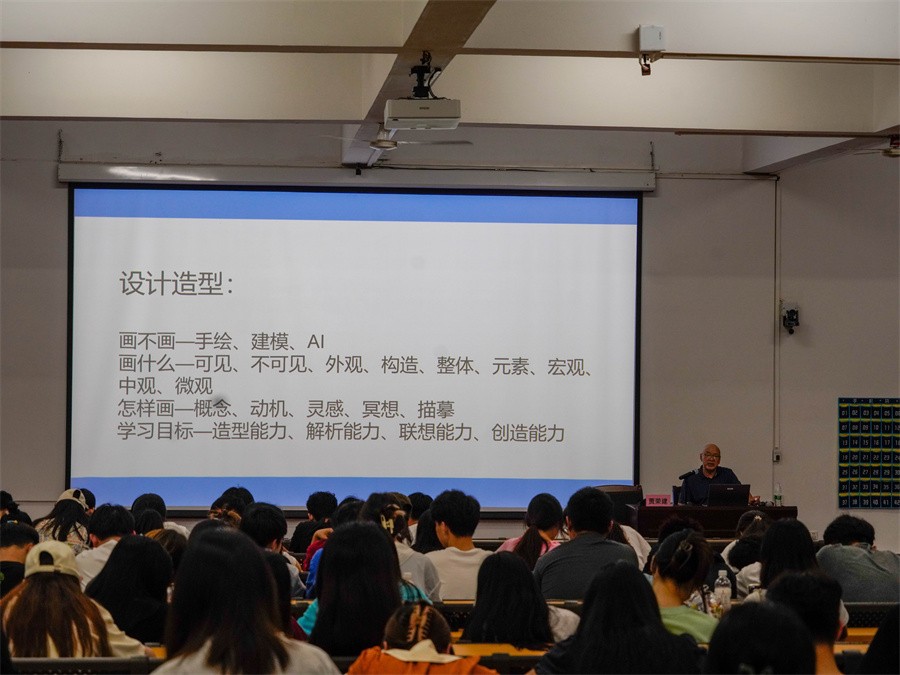 此次讲座中,贾荣建教授开场以问题为导向引入,从设计造型知识、设计造型能力以及设计造型案例分析三个方面进行了相关阐述。他表示作为大学生应具备造型基础能力、思维能力、创造能力和基本的专业素养。