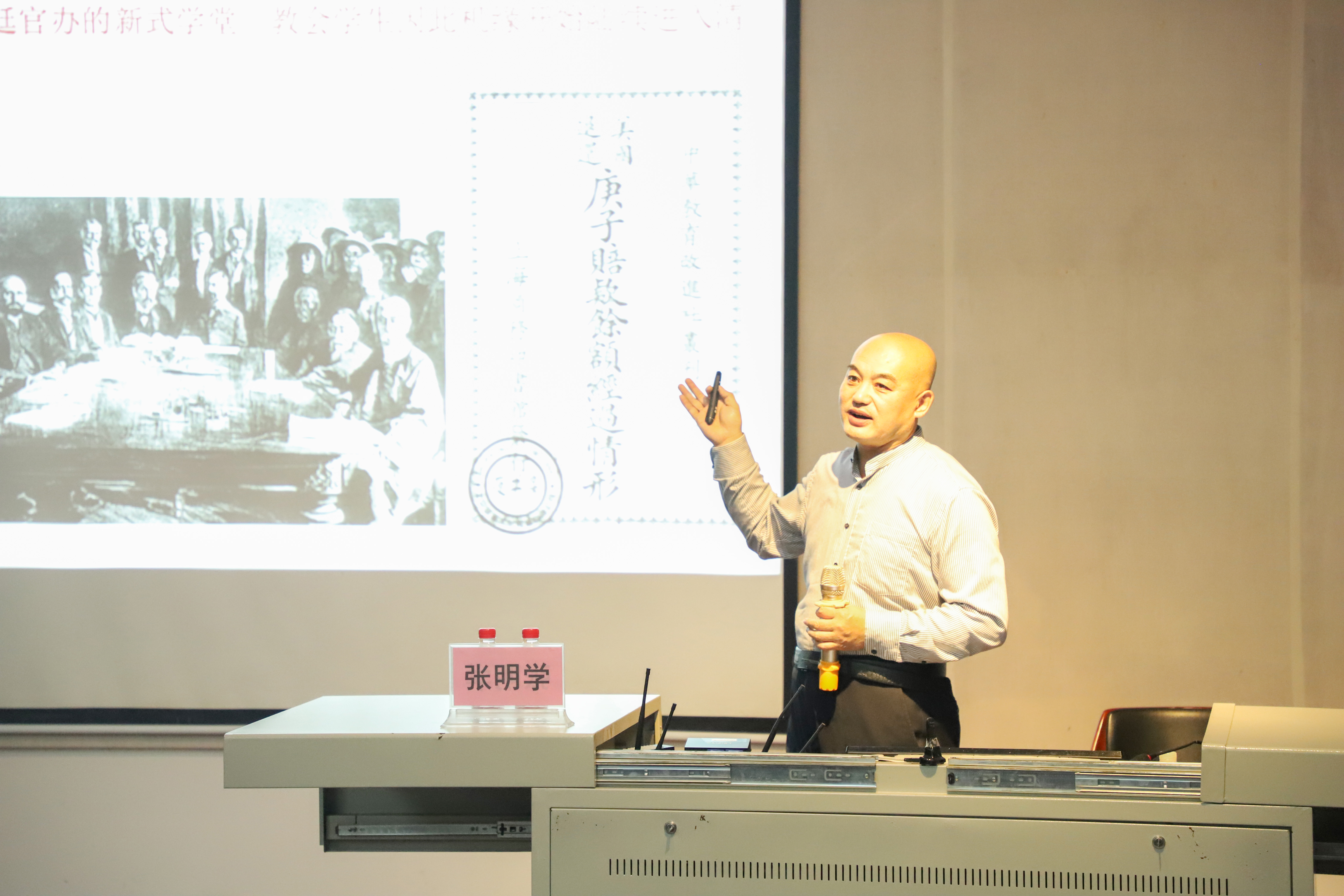 讲座伊始,张教授与大家亲切交流,由自身经历引出中国流行歌曲的启蒙——学堂乐歌的来历。张教授指出,学堂乐歌虽然借鉴了西方的音乐形式,但在内容与精神表达上契合当时的时代精神追求。