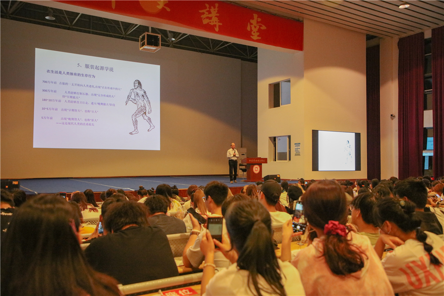 李当岐教授在《西方古代服装文化上》章节中强调学习服装历史的重要性,古为今用,洋为中用,真正认识和理解服装,学会与国际接轨,引导世界潮流,在前人的基础上去发展我们自己的服装事业。李当岐教授给在场师生们推荐了"形象记忆能力"的方法,通过自己手绘画出古往今来代表性的服饰,并通过实例让同学们加深对服装史的认识以及对专业技巧的掌握。李当岐教授说到,扎实学好西洋服装史才会认知其中所隐藏的人文、社会环境,才能更清晰的认识出时代的更替与历程。随后,李当岐教授介绍了欧洲史前服装、古埃及的古代服装、古代西亚等地区的服装发展过程,并分享了他在各国的所见所闻,使同学们对西方服装史有了进一步的了解与认识。