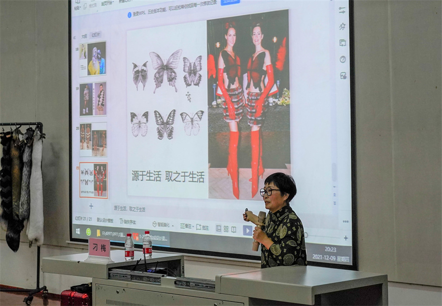 2021年12月9日晚7点30于我校西校区伦理楼107,中国十大皮装设计师刁梅教授为我校师生带来了一场题为《服装设计师的职业素养》的精彩讲座,本次讲座由我校副校长王斌主持。