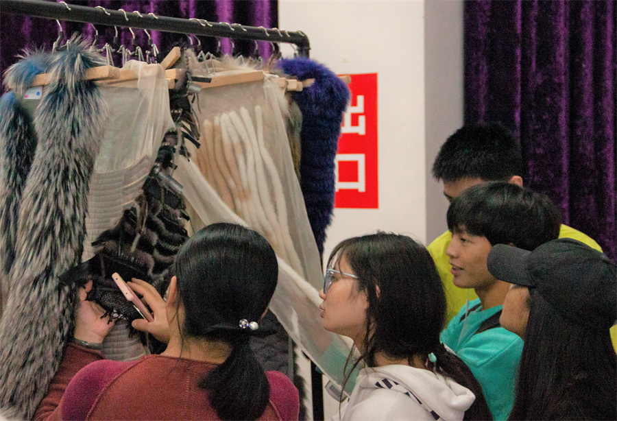 紧接着,刁梅教授用大量图片为同学们介绍了服装设计中黑白色调、粉彩色调、明艳色调、浓郁色调、自然色五个设计色彩基调,她详细解释不同色调的不同用法,为同学们带来更为丰富多样的设计知识。刁梅教授以不同的服装材料为例,向大家说明不同设计材料在设计中的作用,她重点讲解了“毛皮”这一材料,并让同学们亲手体验两种不同的毛皮质感,进一步说明它们运用在设计中会达到的不同服装成品效果。