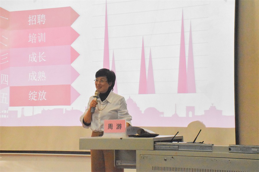 周游教授通过三位优秀主持人的事例,给同学们讲述了作为一个合格的播音员需要经历的阶段——招聘、培训、成长、成熟、绽放。每一个阶段都是一次心路锤炼,大家要注重社会实践,丰富完善简历,在漫长的实践里,寻找努力和坚持的意义,最后将自己的努力花朵绽放。