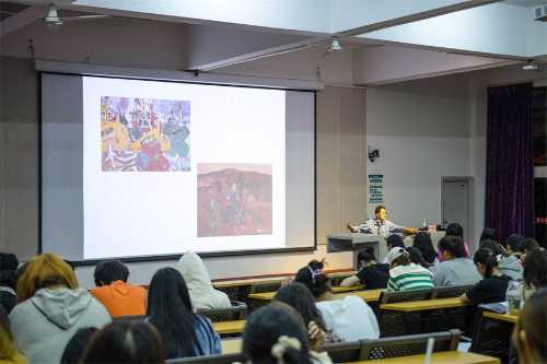 马振庆教授谈及有关色彩的文化内涵,他通过列举医院因颜色差异而造成人的心理差异、东西方对红色和黄色的不同态度两个鲜明的例子,让学生了解不同色彩的文化内涵,从而加深掌握颜色的文化寓意和象征。他还通过塞尚、高更、梵高的作品指出艺术设计是由复杂到简单的过程。在介绍中国风景画时,他建议同学们学习张钦若先生的意象画所表达的主观性特征和吴冠中先生对艺术的执着与探索的精神,在大量的艺术品鉴中养成自我艺术审美和品格。