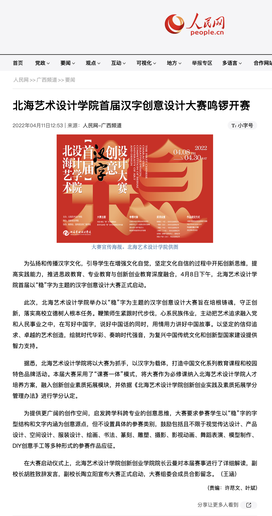 人民网:北海艺术设计学院首届汉字创意设计大赛鸣锣开赛