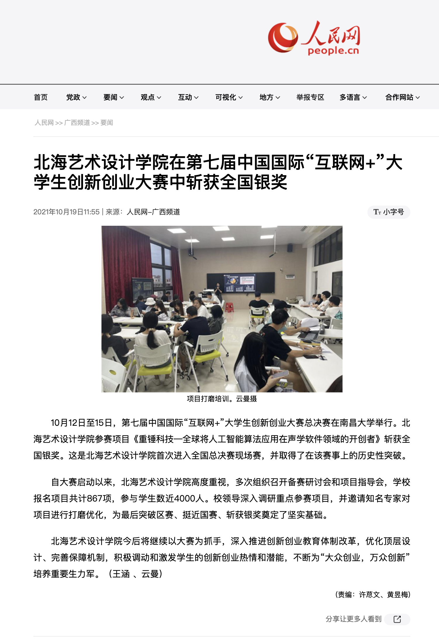 人民网:北海艺术设计学院在第七届中国国际“互联网+”大学生创新创业大赛中斩获全国银奖