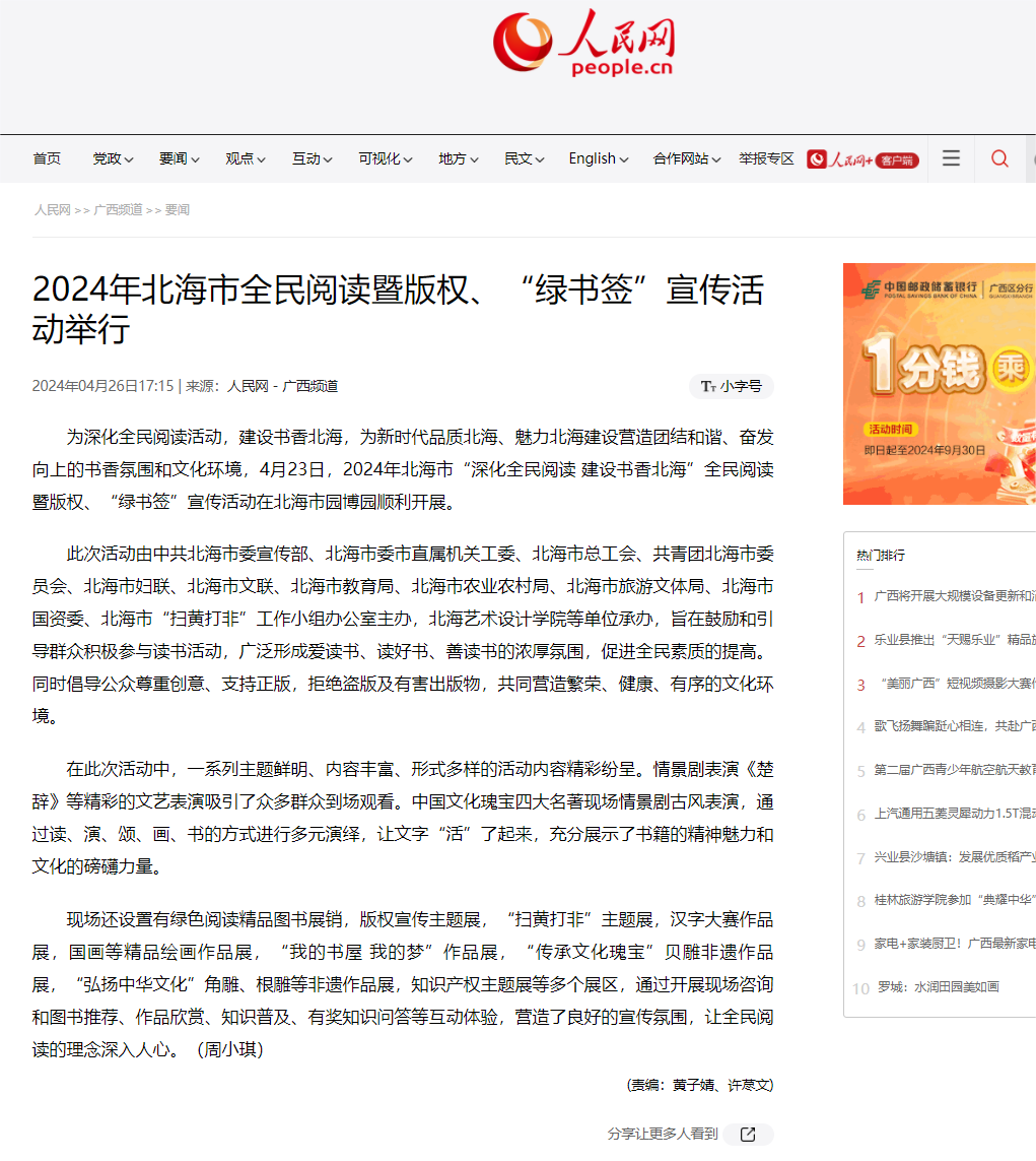 人民网:2024年北海市全民阅读暨版权、“绿书签”宣传活动举行