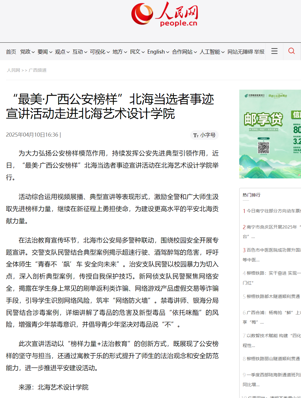 人民网:“最美·广西公安榜样”北海当选者事迹宣讲活动走进北海艺术设计学院