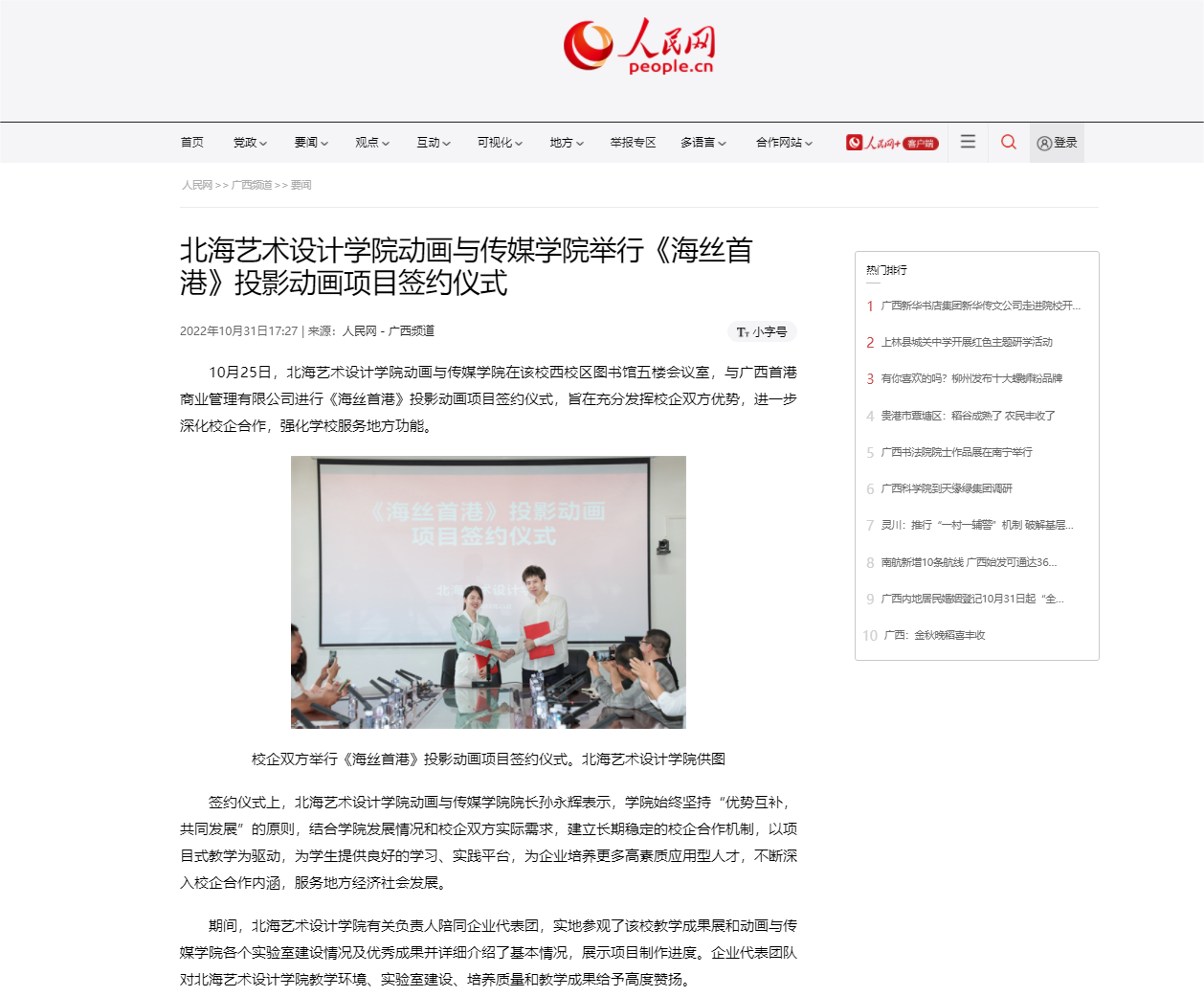 人民网:北海艺术设计学院动画与传媒学院举行《海丝首港》投影动画项目签约仪式