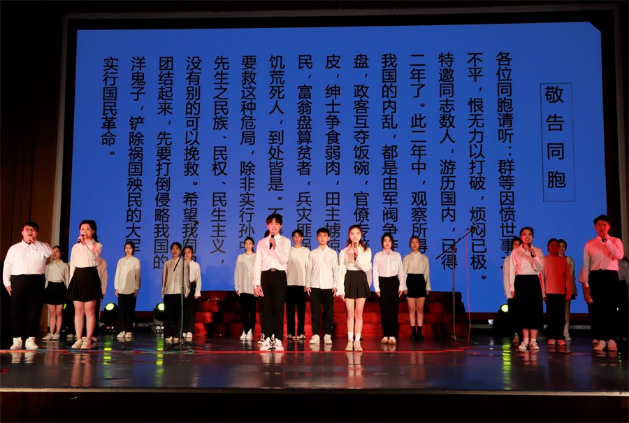 第三篇章“砥砺奋进新征程”,展示了党的十八大以来中国特色社会主义建设取得的伟大成就,以及党的二十大胜利召开具有的重大意义。《中国这十年》节目由马克思主义学院覃家惠教授结合党的二十大报告精神,生动展示了中国这十年取得的历史性成就和发生的历史性变革,使在场师生进一步增强民族自信心和自豪感,坚定实现中华民族伟大复兴中国梦的志气、骨气、底气。歌曲《领航》表达了师生们对中国共产党的深厚情感,对实现国家富强、民族振兴、人民幸福的坚定信心。集体诵读《请党放心强国有我》表达了北艺学子坚定理想信念,矢志拼搏奋斗,不断砥砺奋进的铿锵誓言。
