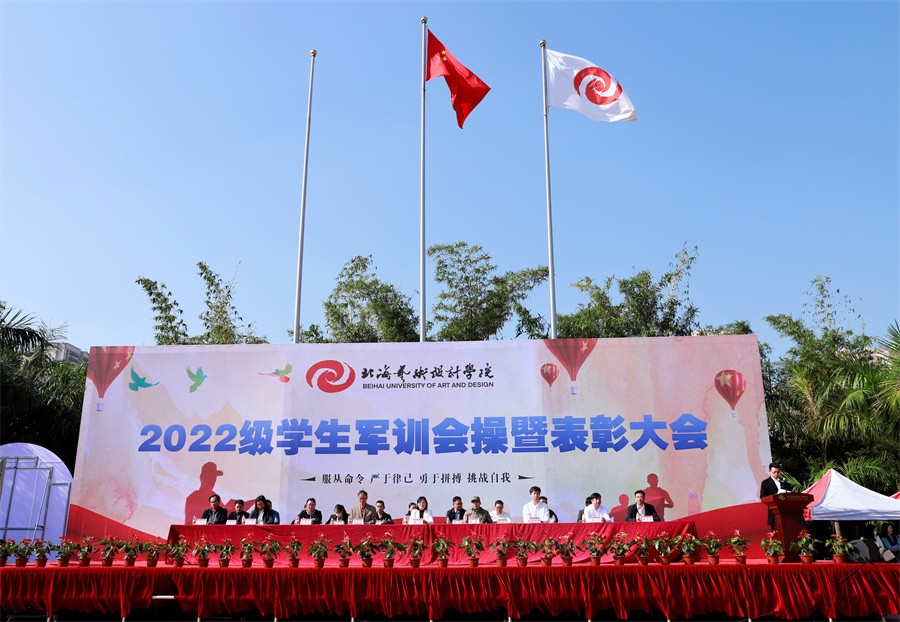 北海市海城区人民武装部政委王鑫在讲话中表示,此次军训时间安排紧、科目内容多、训练强度大,是一次体力与意志的较量、纪律与服从的检验。他对全体参训学生能够克服困难,出色完成所有军训任务的优良表现给予了高度评价和充分肯定。他强调,强国必须强军,军强才能国安,国防和军队建设,是国家安全发展的坚强后盾。近年来,北海艺术设计学院高度重视征兵工作,出台各种优待政策,鼓励学生积极报名参军,每年都有大批优秀学子走入军营,建设国防。他表示海城区征兵办作为学校学生应征入伍工作的办事机关,将继续竭诚为学校和广大学子做好应征入伍的各项工作。他呼吁我校广大学生在完成学业后,积极携笔从戎,参军入伍,为加强国防和军队现代化建设,实现建军一百年奋斗目标贡献力量。
