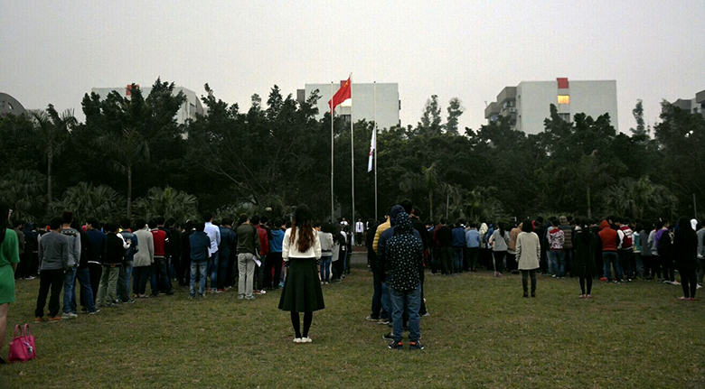 三羊开泰,新春伊始。随着3月7日、8日学生们陆续返校,北海艺术设计学院迎来了2015年春季新学期。迈向新一轮成长与成才之路的上千名同学(不含北京校区学生)于9日清晨情绪饱满参加了2015年春季学期的第一次升旗仪式。