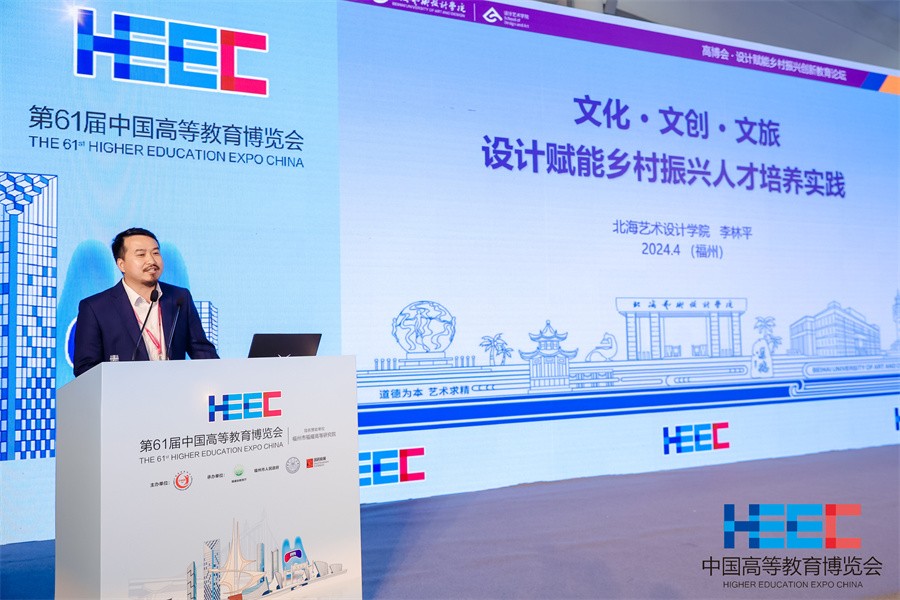 我校设计艺术学院院长李林平教授受邀作为演讲嘉宾,发表了“文化·文创·文旅——设计赋能乡村振兴人才培养实践”的主旨报告,报告围绕着设计教育在乡村振兴中所面临的问题,提出了设计赋能乡村振兴人才培养的策略和路径,并总结了设计艺术学院近年来乡村振兴领域取得成效。