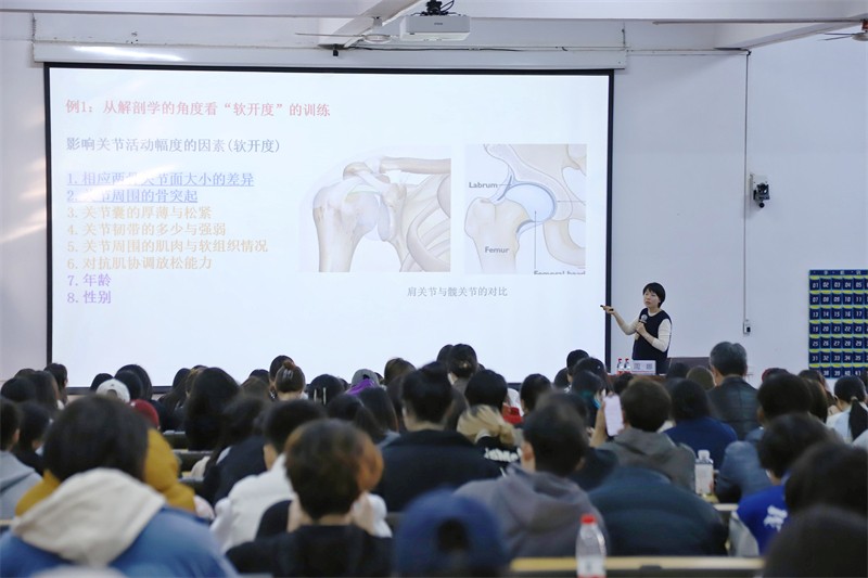 随后,周娜教授围绕舞蹈科学的核心理论展开讲解。她深入解析了舞蹈解剖学中人体形态结构、生长发育规律与舞蹈训练之间的内在联系,引领师生重新审视“软开度”训练,探讨肌肉的形态结构、工作模式及物理特性对舞蹈的影响。此外,周娜教授还阐述了舞蹈训练学原理,对契合科学规律的舞蹈训练经验予以理论升华,总结出舞蹈训练的普遍规律,并介绍了一系列舞蹈训练恢复的原理与方法,强调通过科学训练,舞者能够充分挖掘身体潜能,推动舞蹈技艺迈向新高度。