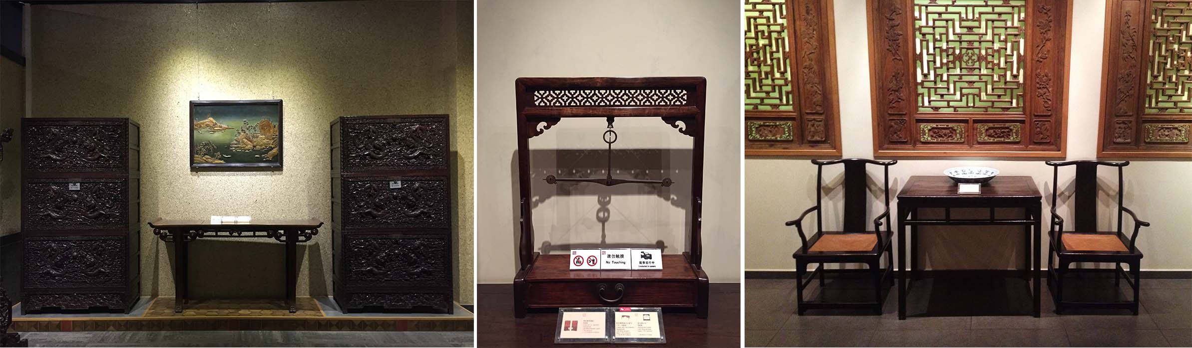家具馆里陈列了中式家具,每件家具再配以当时的摆置形式,一个活生生的历史场景就呈现在眼前,行走其中,竟有穿越古今之感。明朝家具的典雅,清朝家具的华丽,一览无余。