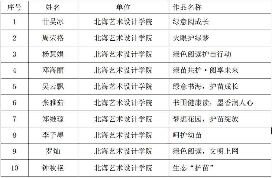 近日,北海市委宣传部公布了北海市2025年“绿书签行动”海报设计作品征集活动入围名单,我校师生共计10人入围。