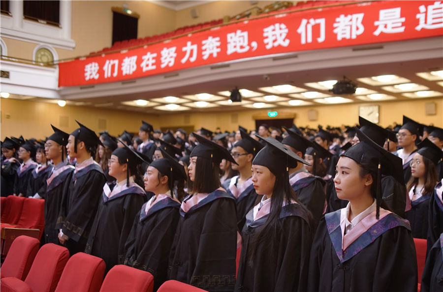 伴随着庄严肃穆的国歌想起,典礼拉开序幕,主持人介绍了2019届毕业生的基本情况,代表学校向圆满完成学业的两千多名毕业生表示祝贺,向培养学生成才的父母、学校全体教职工表示衷心的感谢。同时对所有毕业生顺利毕业表示最热烈的祝贺。