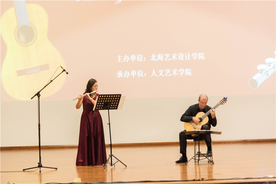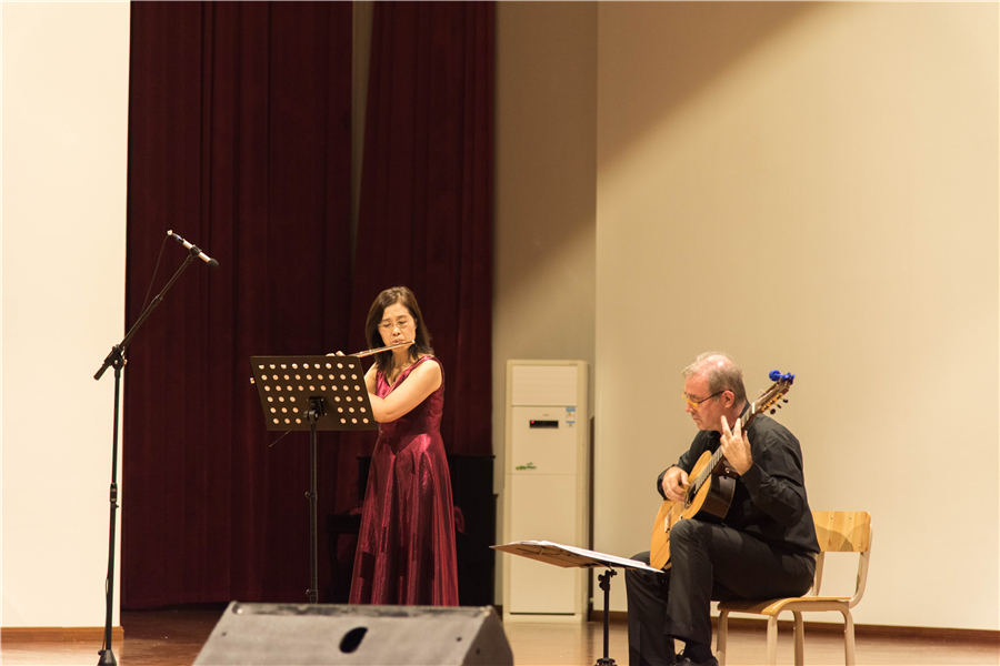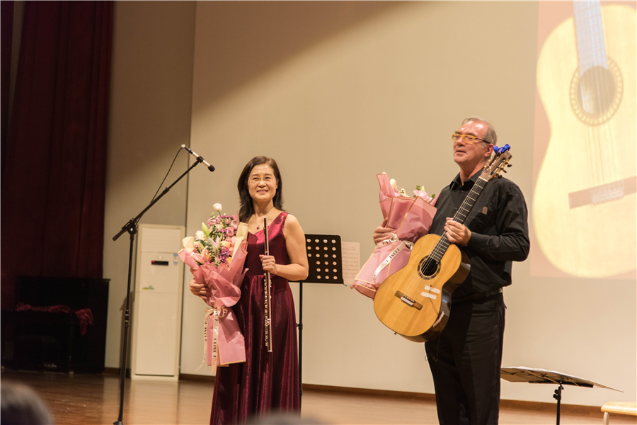 2019年10月31日晚,古典吉他与长笛二重奏音乐会在我校大礼堂成功举办,此次音乐会有幸邀请到来自法国的古典吉他演奏家埃瑞克·佛朗塞利和旅法长笛演奏家郝雪雯同台献演。两位艺术家为我校师生带来了一场精彩的视听盛宴!