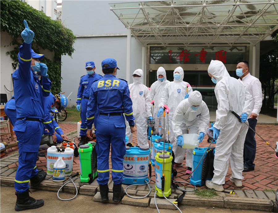(北海蓝天救援队对我校员工进行消杀培训)