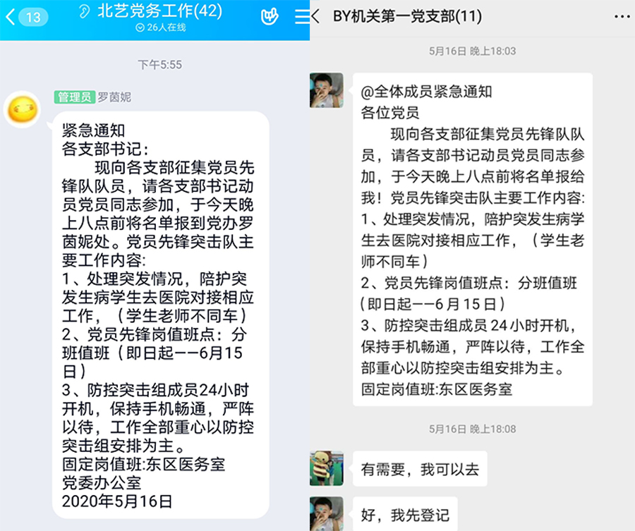 针对开学后应对学生突发情况的任务越来越重,党委向各党支部发出征集党员突击队员的号召,通知一经发出得到了党员教师的积极响应。建筑学院党支部蒙奎宇:“只要党组织需要,我就上。” 机关第二党支部张琪:“我报名突击队,帮他们分担分担,看他们每天挺累的。”机关第一党支部文娇丽:“有需要,我可以去。”打赢校园疫情防控保卫战,党员教师用行动书写师者情怀,用担当履行入党誓言。