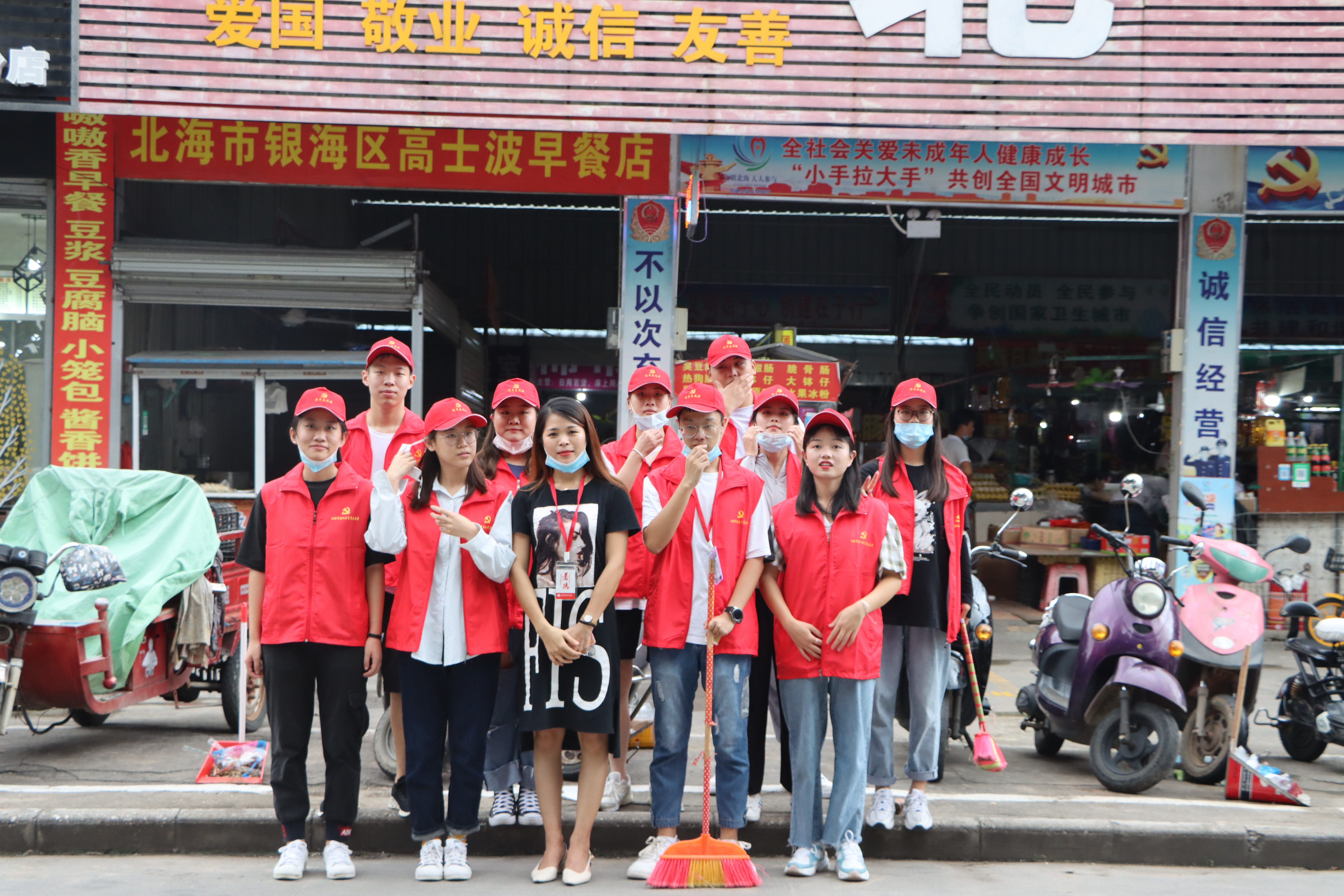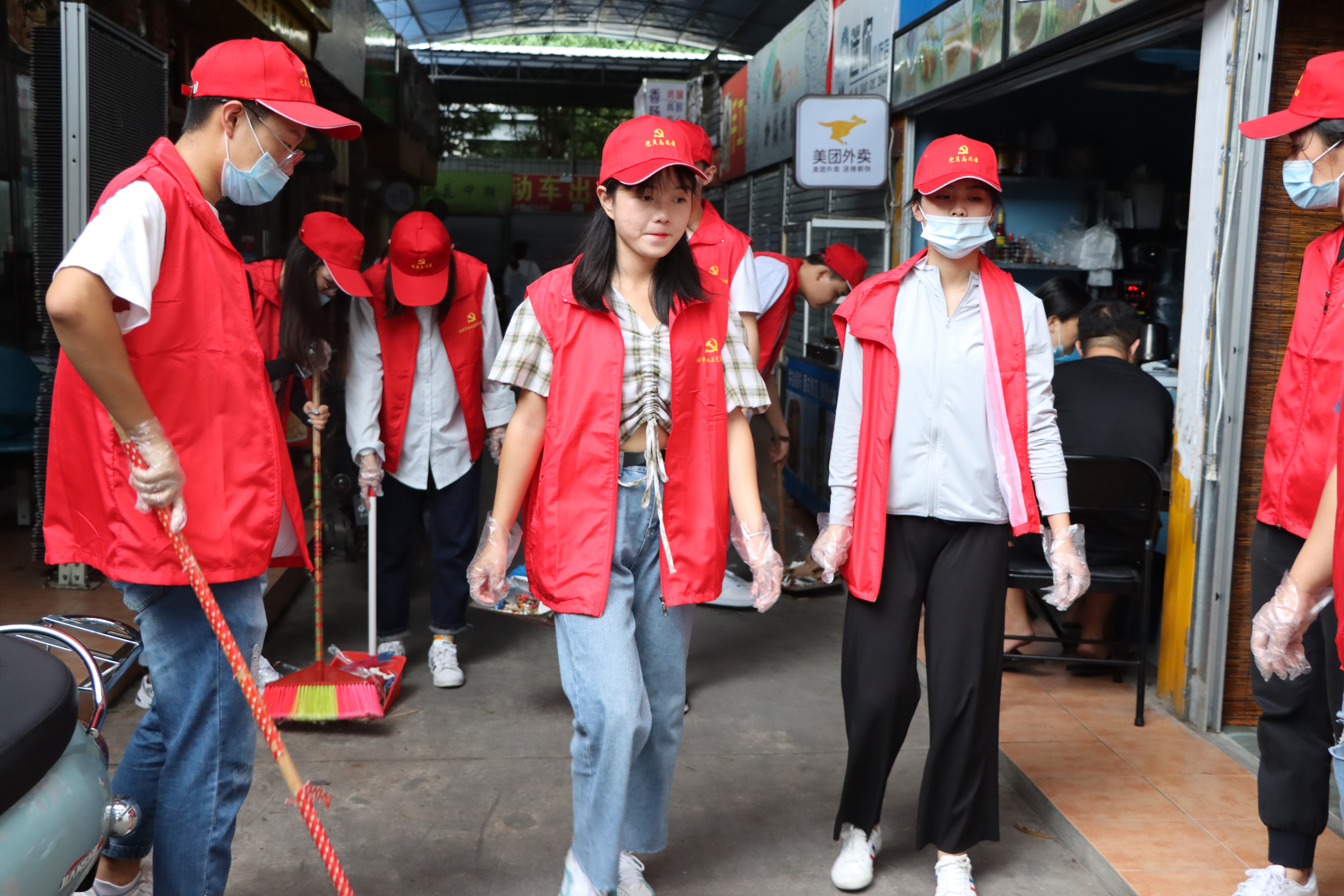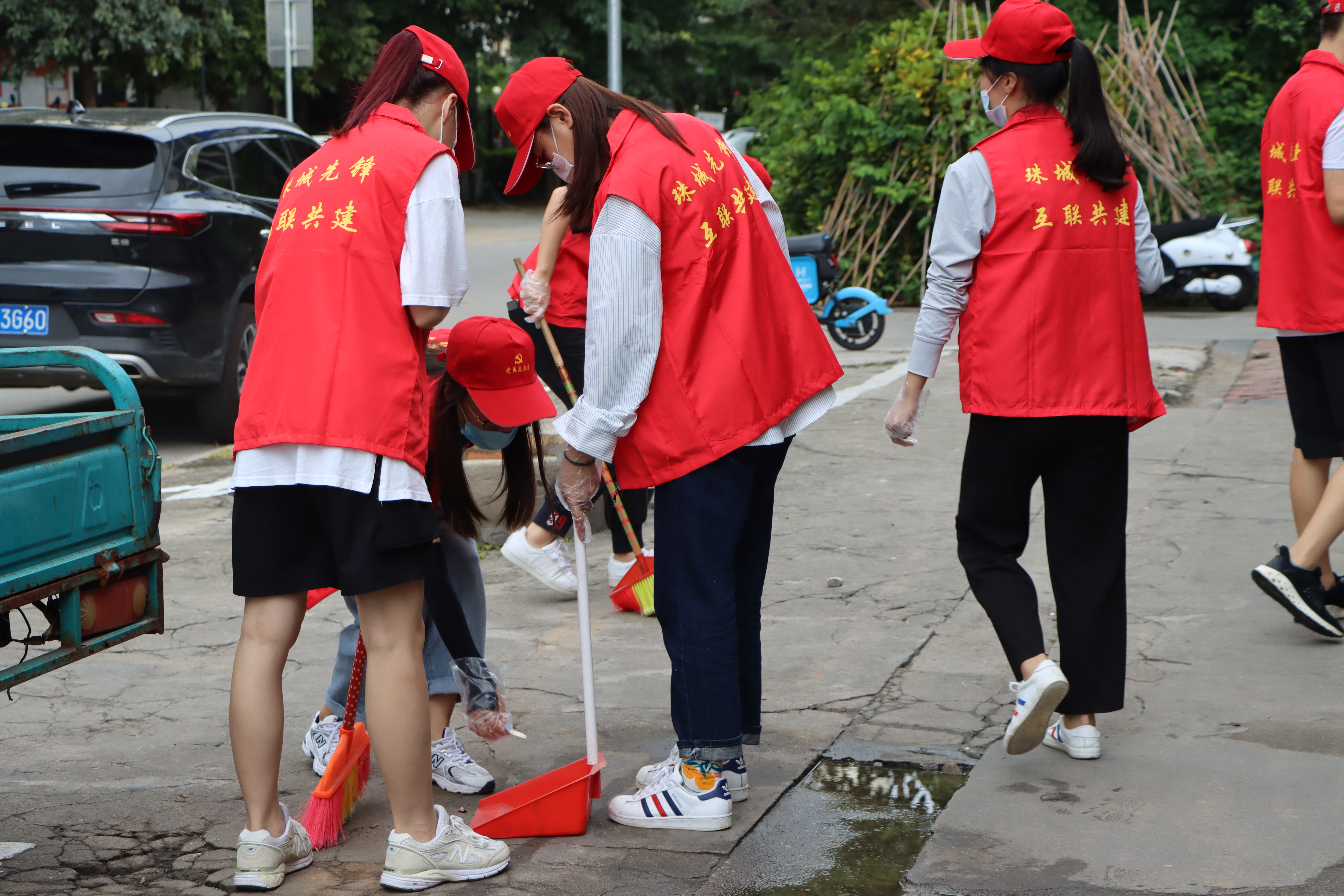 为全力冲刺创城迎国检,2020年9月20日下午,我校由党员教师与团委青年志愿者协会组成“创城突击队”前往北艺市场开展“珠城先锋 互联共建”创城迎国检环境整治攻坚活动。