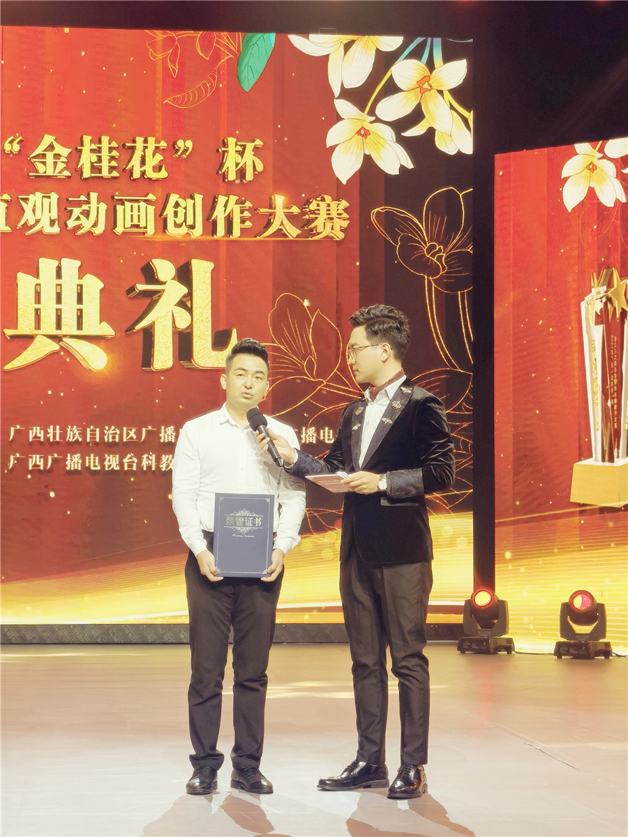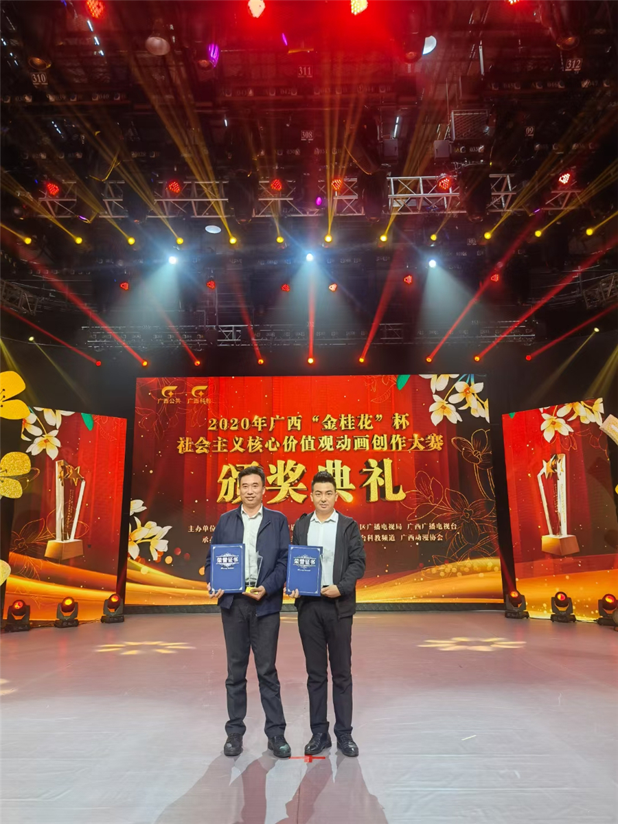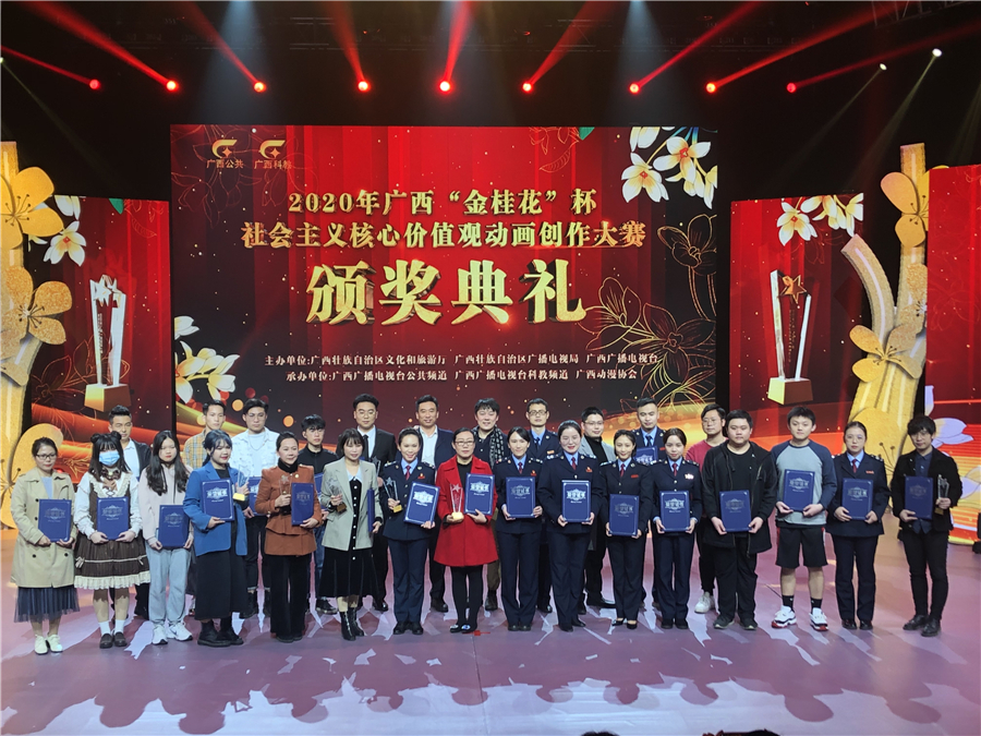 近日,2020年广西“金桂花”杯社会主义核心价值观动画创作大赛颁奖典礼在广西广播电视台演播厅举行。自治区文化和旅游厅党组成员、副厅长唐正柱,自治区广播电视局党组成员、副局长吴晓丽,广西广播电视台副总编辑郑葵等主办方代表出席了颁奖典礼。我校动画学院常务副院长陶立阳、动画学院副院长孙永辉受邀参加颁奖典礼。