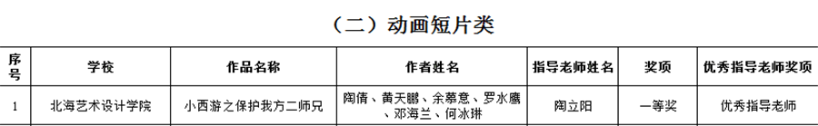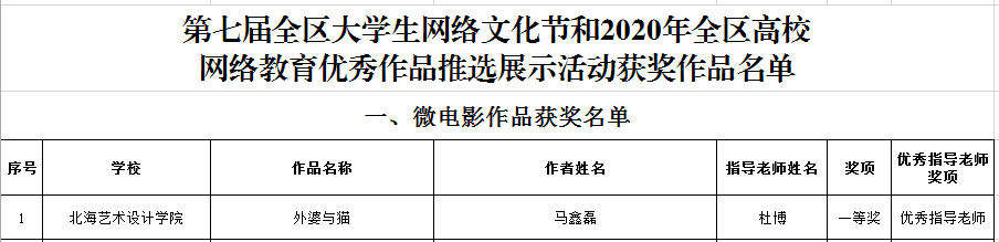 近日,自治区教育厅、自治区党委网信办下发《关于公布第七届全区大学生网络文化节和2020年全区高校网络教育优秀作品推选展示活动获奖名单的通知》,其中,我校的动漫短片《小西游之保护我方二师兄》和微电影《外婆与猫》两部作品均取得了一等奖的佳绩,陶立阳、杜博获评优秀指导教师。